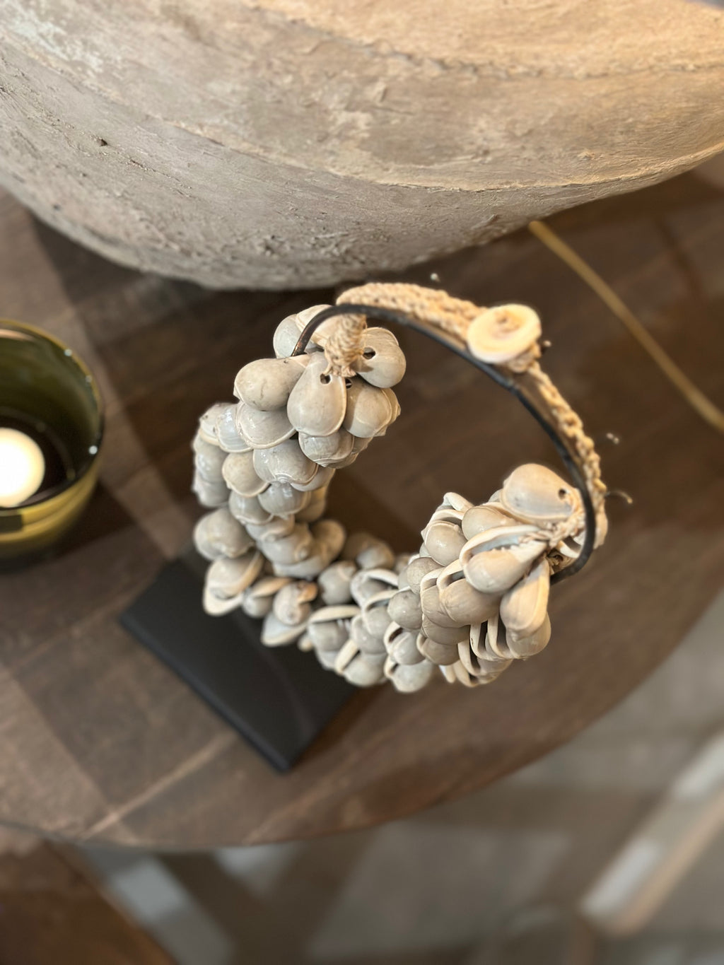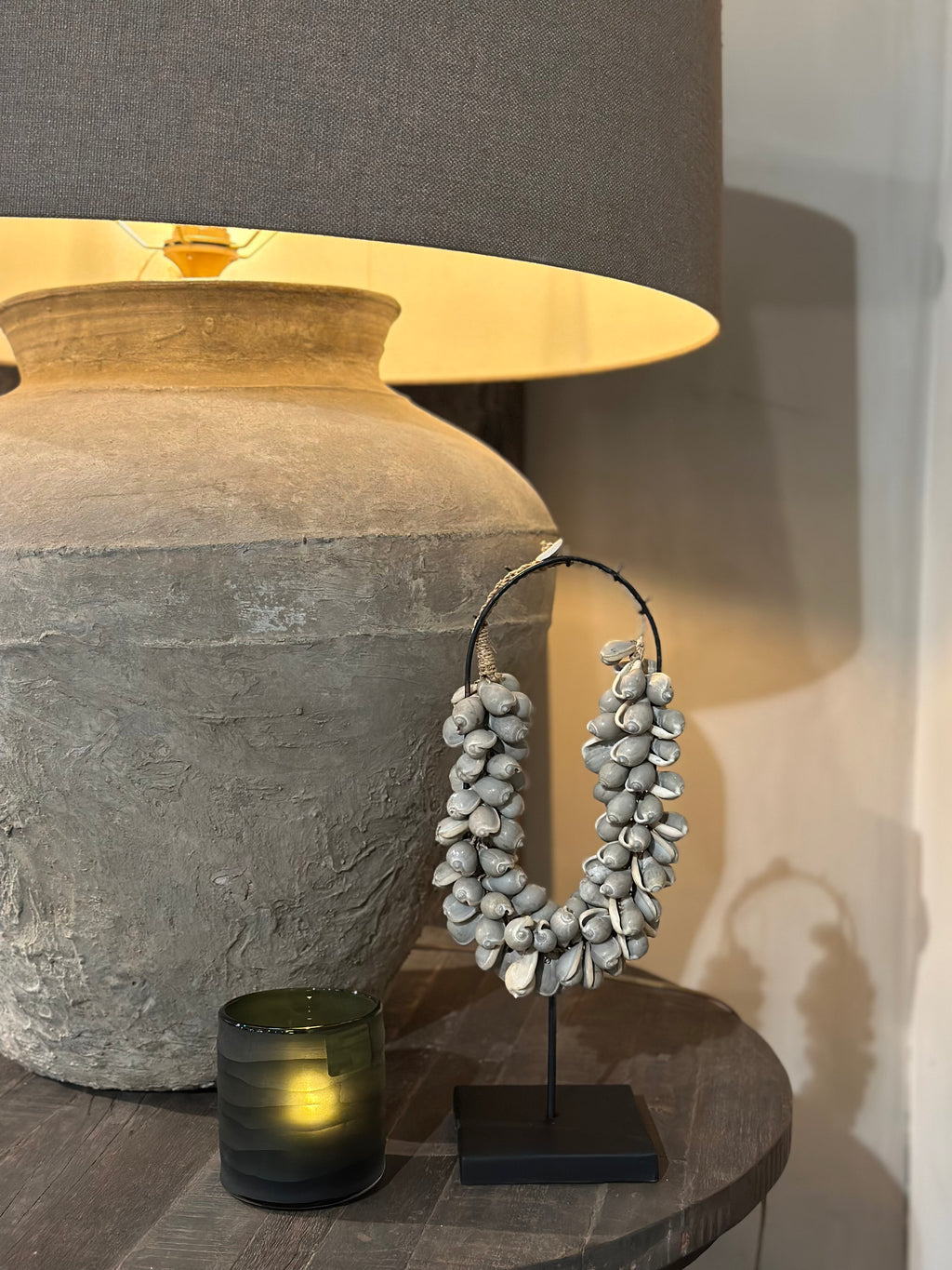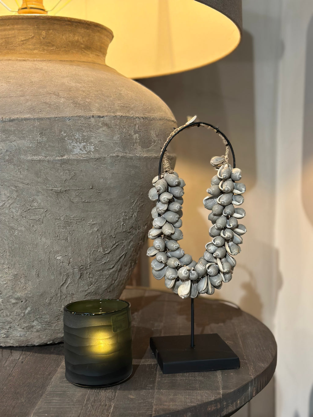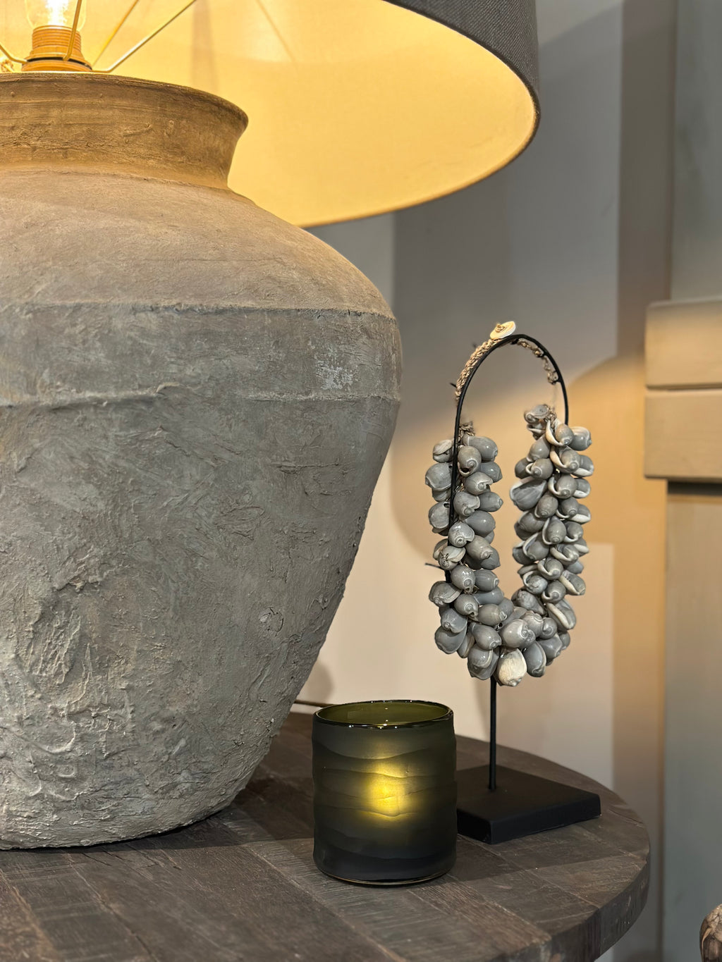Deze glazen stolp heeft een vergrijsd houten voet en is met de hand gemaakt. De stolp is leuk om een klein beeldje, plantje of een andere lieflijke decoratie onder te zetten. Door het mondgeblazen glas ziet iedere stolp er net even anders uit.
