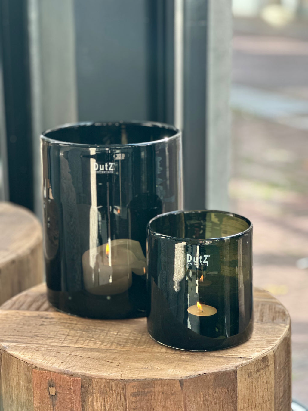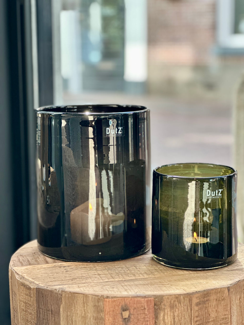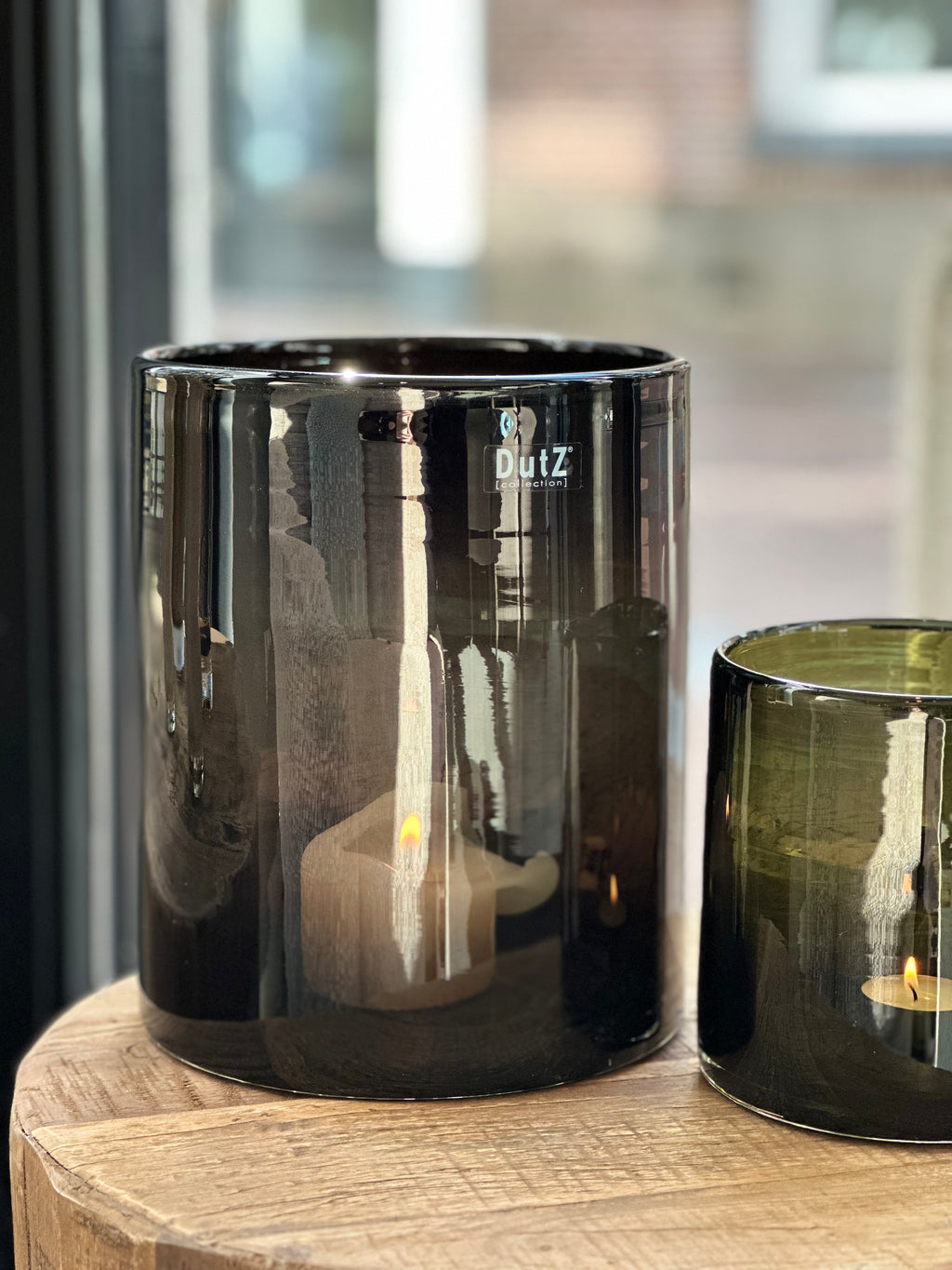 Een statement in smoke: deze grotere cilinder van DutZ Collection is mondgeblazen en uniek in zijn kleur en vorm. De diepe zwarte glasstructuur met een paars- of groenachtige gloed geeft een bijna mysterieuze sfeer, vooral bij kaarslicht.