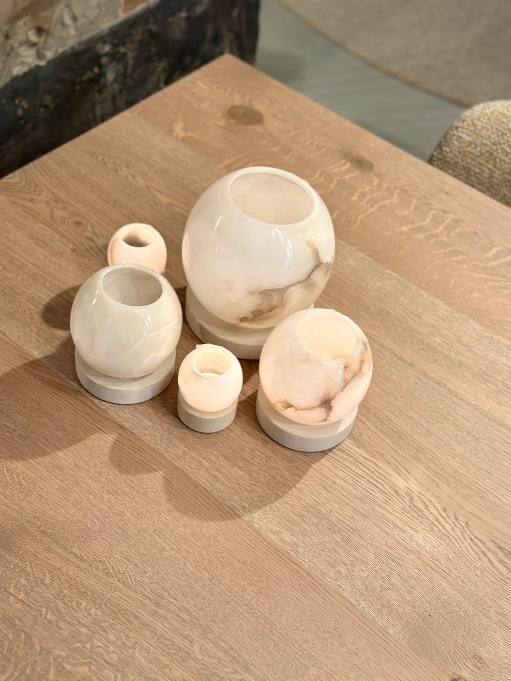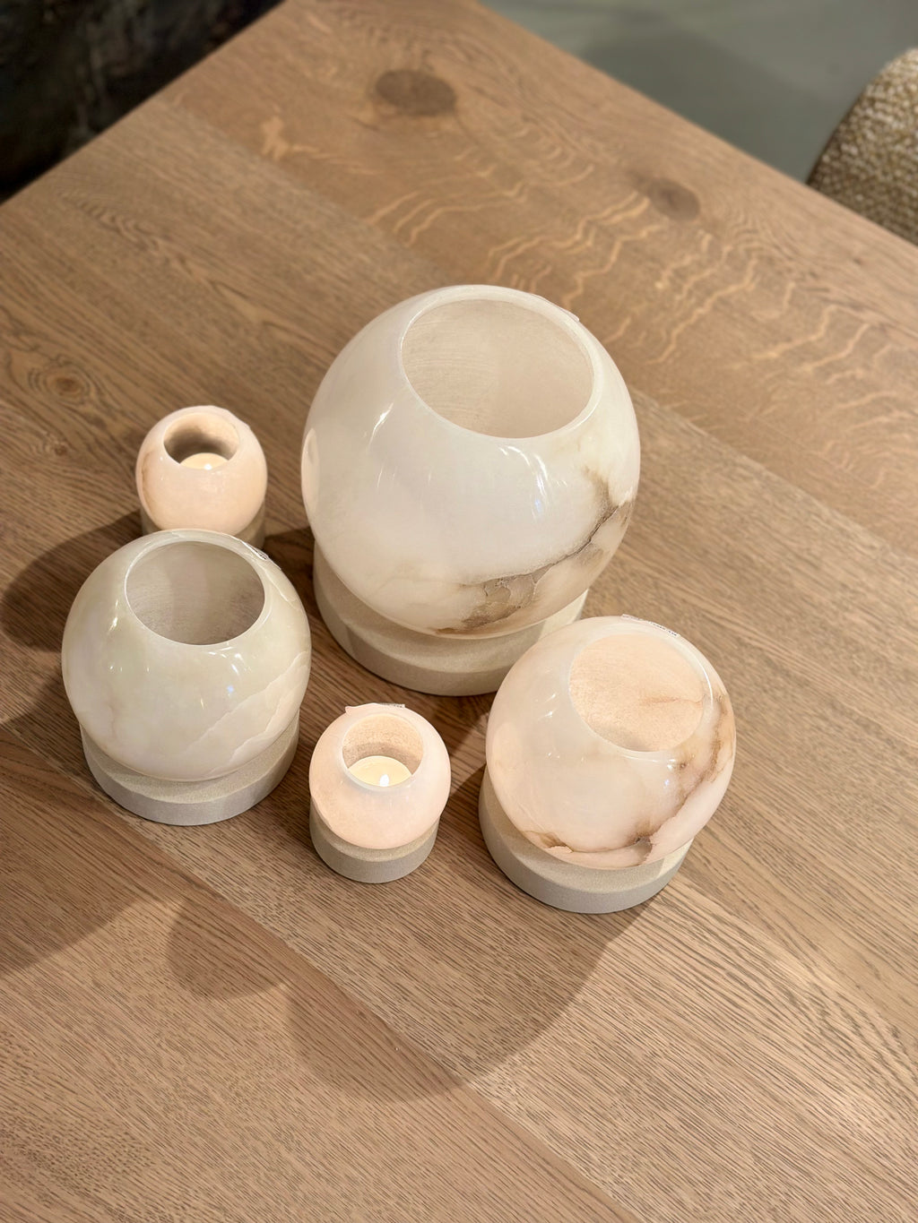 De zandstenen voet is stevig en de uitholling zorgt ervoor dat het ronde albast windlicht mooi blijft staan. De kleuren variëren van warm beige tot bijna wit met amberkleurige accenten.