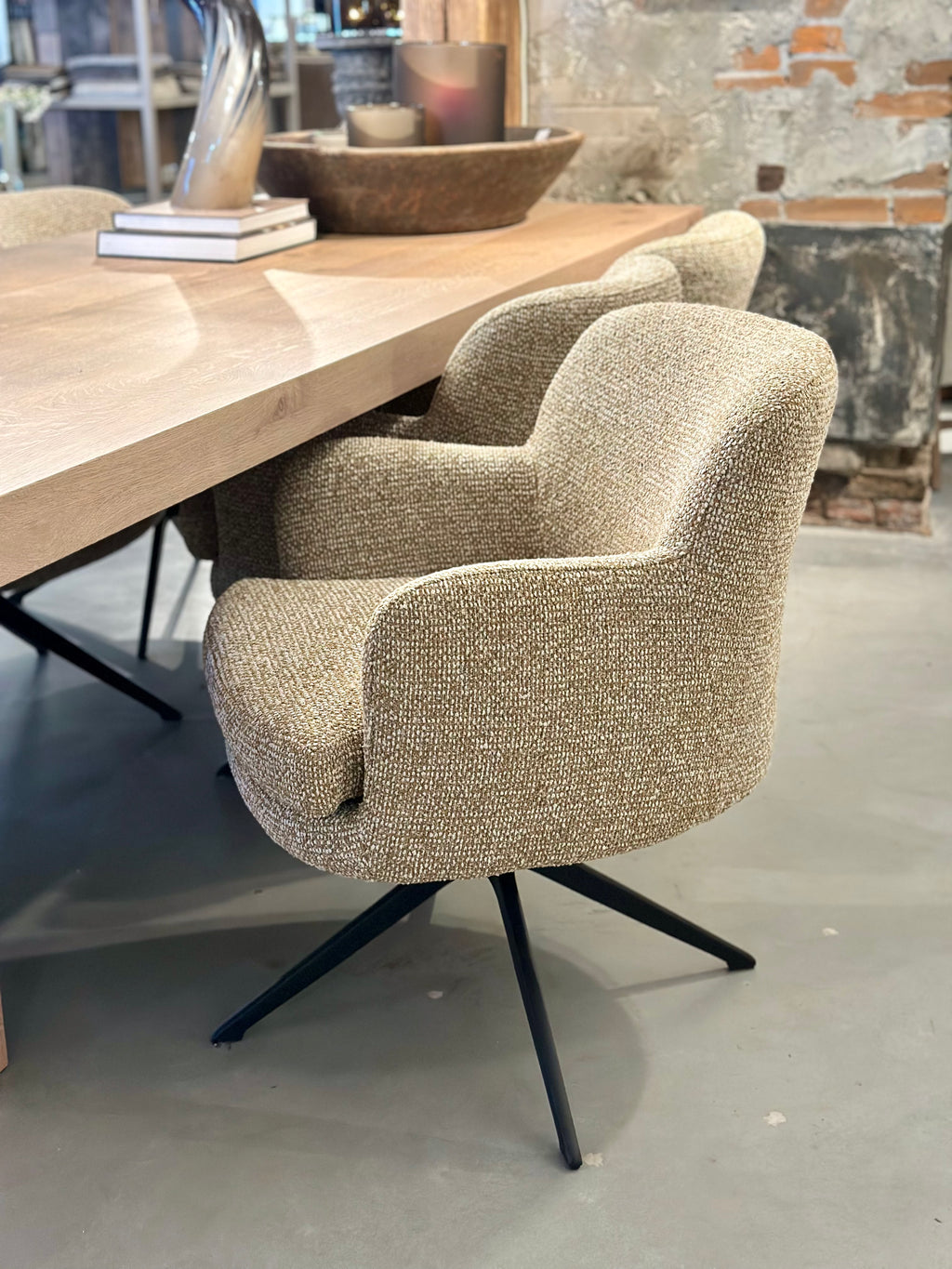 De draaipoot – in onze winkel uitgevoerd in zwart – draait subtiel en gecontroleerd: je moet echt zelf even afzetten met je voeten. Wel zo fijn, want dit voorkomt dat je ongewenst wegdraait bij het zitten. De poot is ook verkrijgbaar in zandkleur met glitter en bronskleur met glitter – net als de metalen strip op tafel Strip. Zo stel je moeiteloos een harmonieus interieur samen.