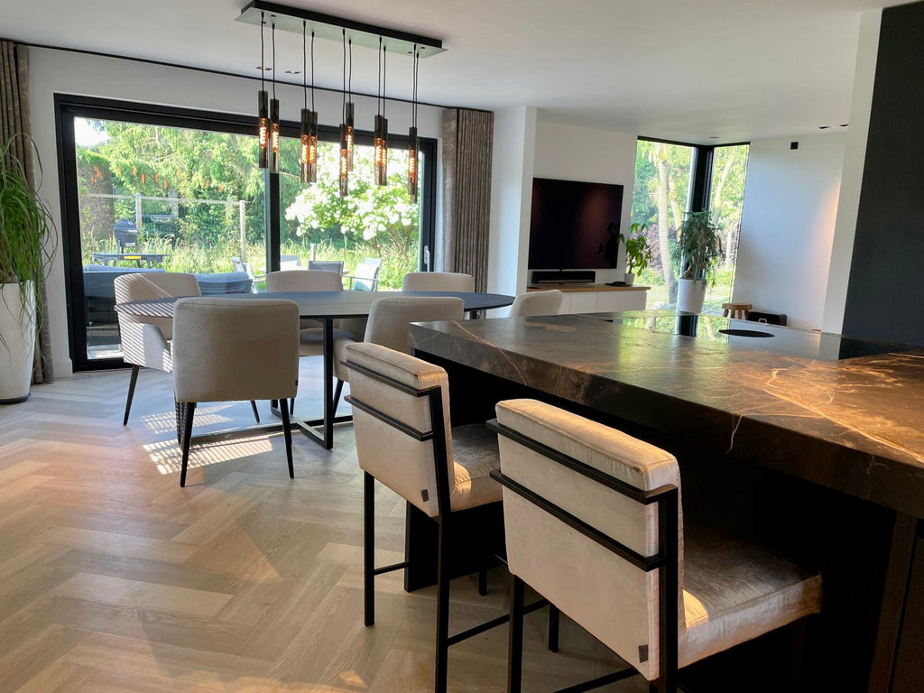 Tafel Global is een ovale tafel van eikenhout, gecombineerd met stoere metalen slofpoten. Bij dit specifieke project is gekozen voor een 1/3 – 2/3 opstelling van de poten, zodat er geen hinder is van een middenpoot bij zes stoelen. Slimme keuze...