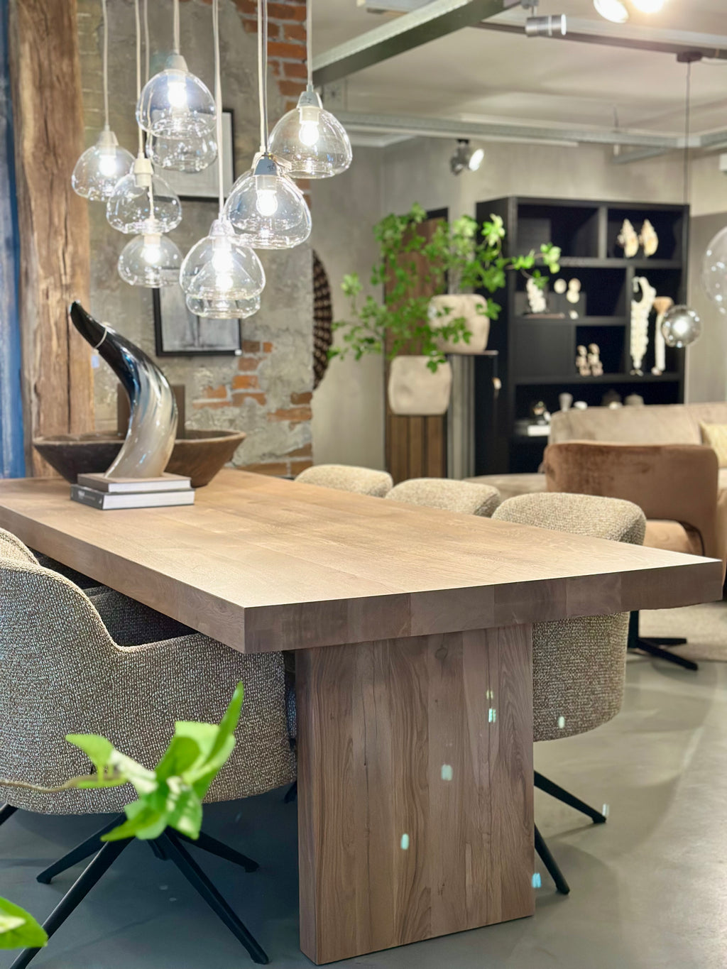 De tafel is gemaakt van 8 cm dik semi-massief eikenhout met een eiken fineerafwerking. De brede blokpoten geven de tafel een robuuste uitstraling. De afstand tussen de poten is 187 cm, wat zorgt voor voldoende ruimte voor 3 stoelen naast elkaar.