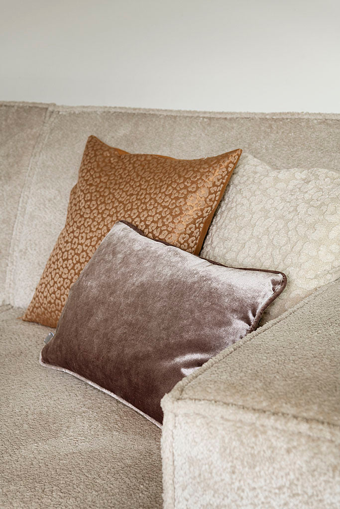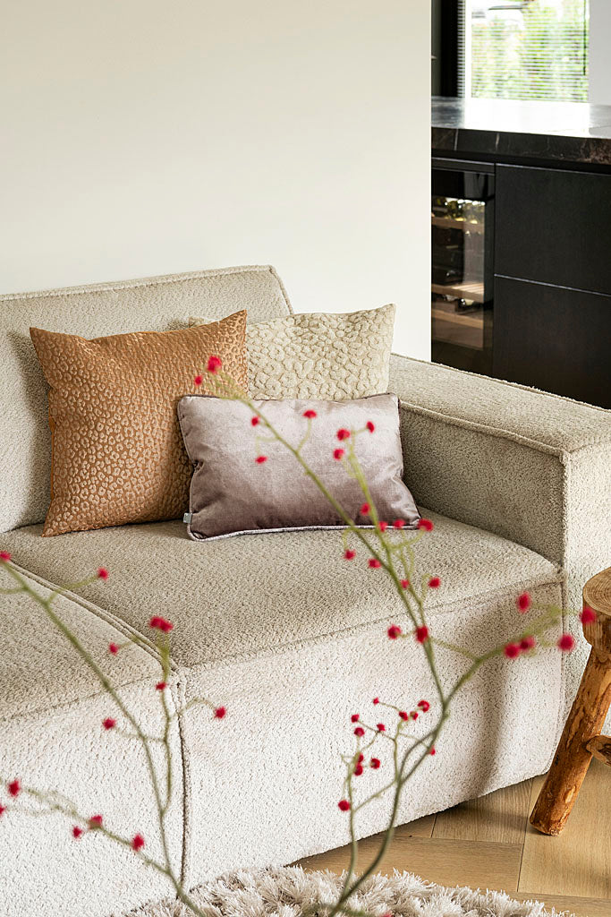 Bank Tori is een modulaire bank met verrassend veel flexibiliteit. De rugleuning is handmatig verstelbaar, zodat je kunt kiezen tussen een actieve zit (58 cm diep) of juist een extra loungezit (73 cm diep). Voor deze uitvoering is een zachte, fluffy stof gekozen die subtiel parel‑/oestereffect heeft — afhankelijk van de lichtinval verschuift de uitstraling.
