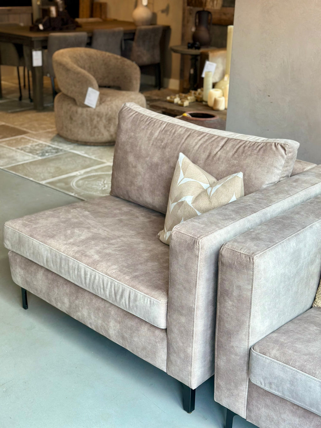 De stof op het model in onze winkel is een zachte velours stof die waterafstotend, vlekwerend en erg sterk is. De stof verkleurt nauwelijks, gaat niet snel lubberen of pillen en blijft lang mooi. Dat maakt deze stof een fijne keuze voor gezinnen, huisdieren of een huis waar vaak mensen over de vloer komen.