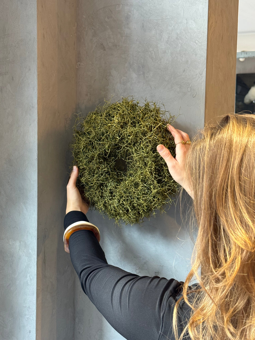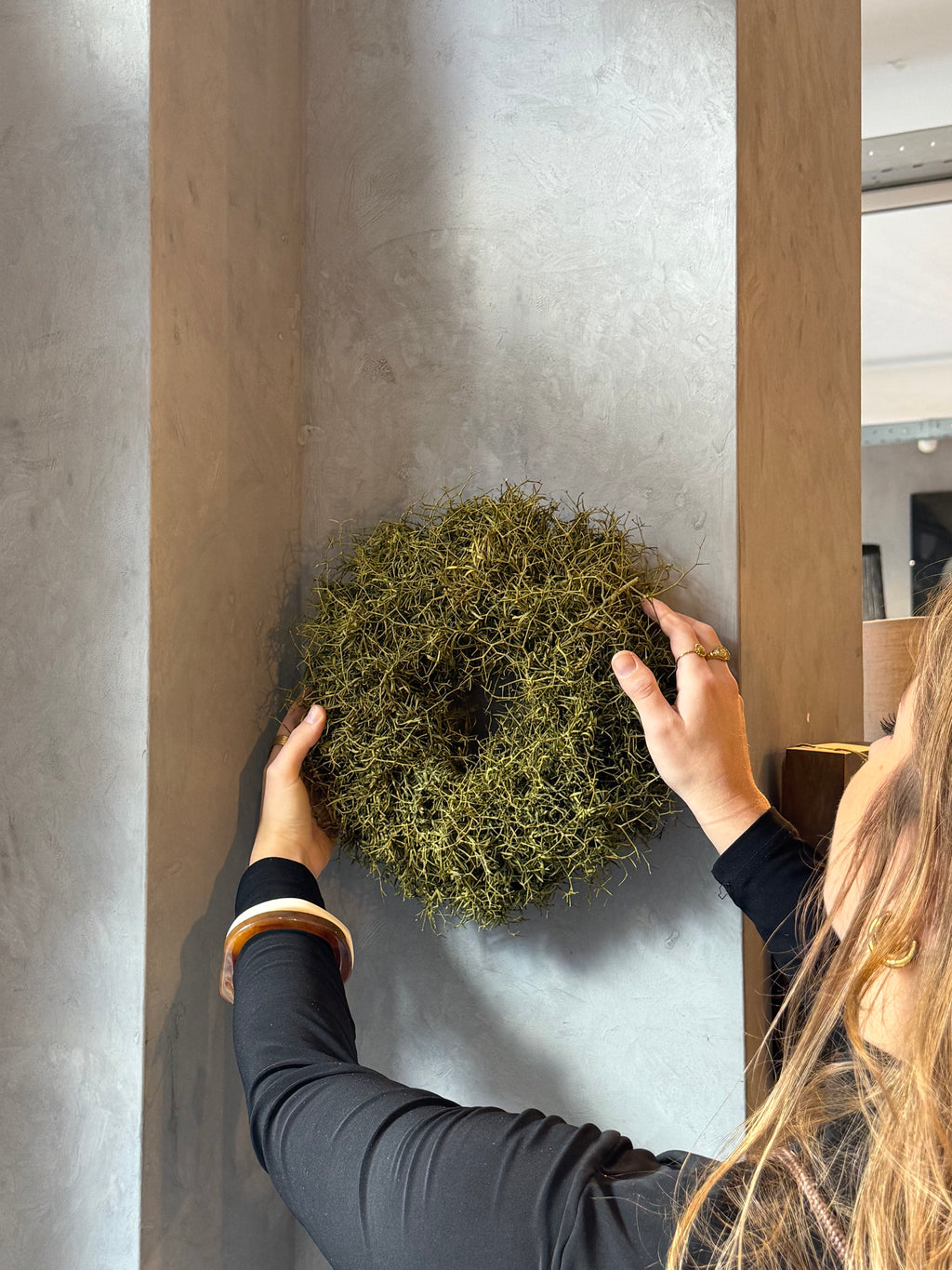 Deze krans van Iron Bush blijft mooi groen. De takjes zijn droog en blijven deze kleurtint. De krans is ongeveer 30 cm in doorsnede en 7 cm dik. Je kunt hem ophangen aan de muur of neerleggen op een schaal met een windlichtje erin.