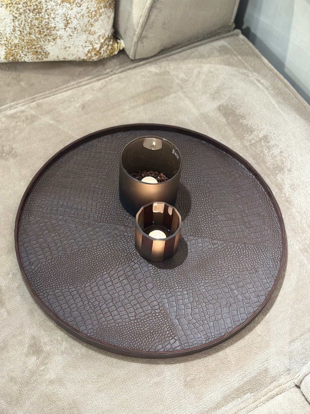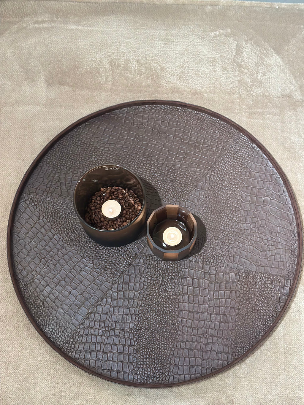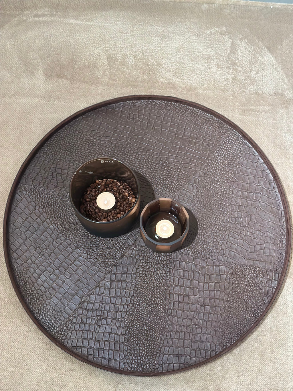 Dit XL ronde dienblad van Chamada is een echte blikvanger op een grote salontafel of eettafel. Gemaakt van hoogwaardig rundsleer met een donkerbruine krokoprint en afgewerkt met een viltlaag aan de onderzijde.