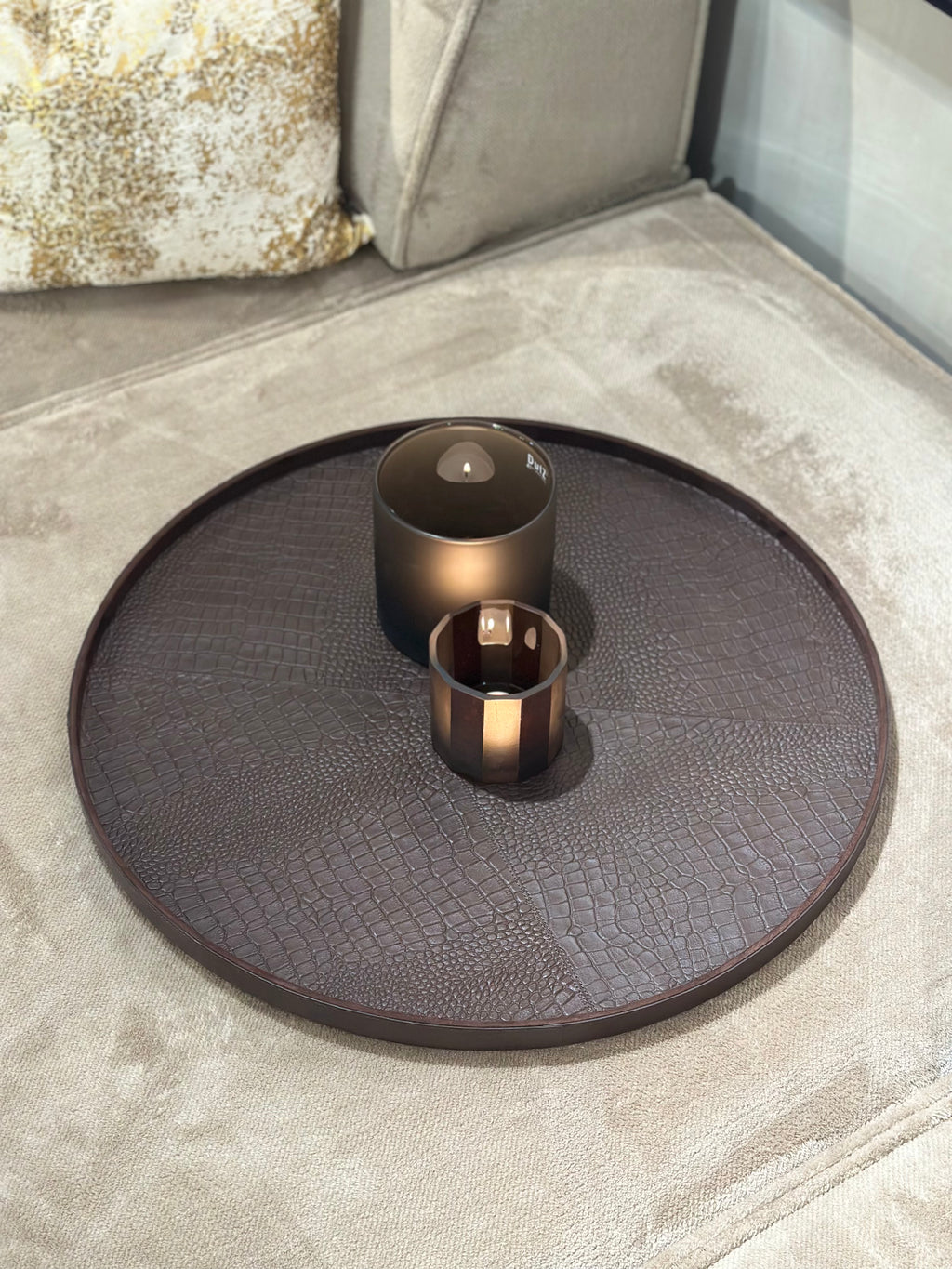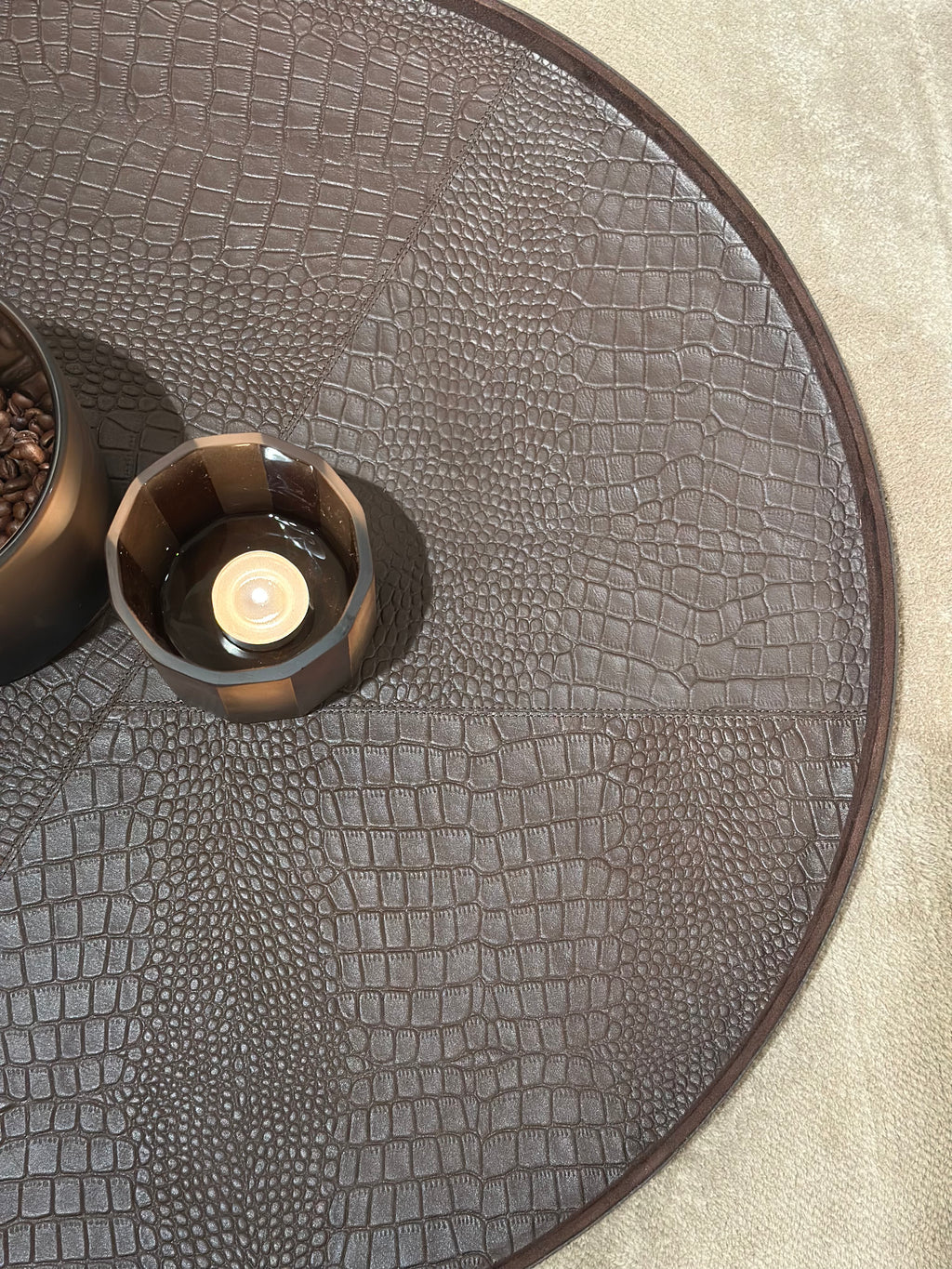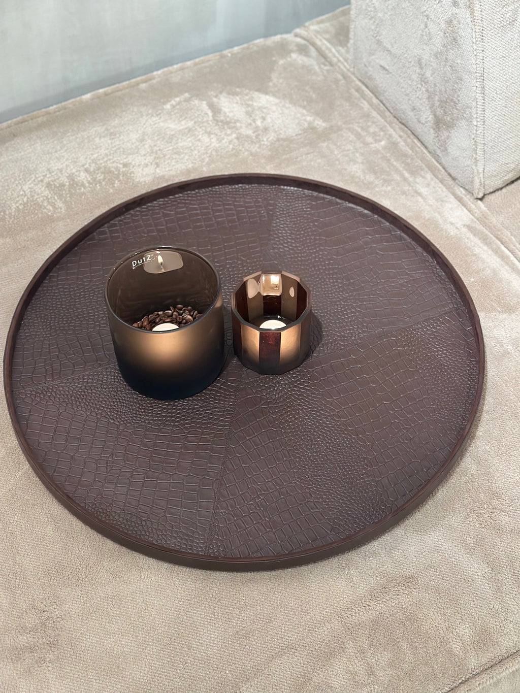 Dit XL ronde dienblad van Chamada is een echte blikvanger op een grote salontafel of eettafel. Gemaakt van hoogwaardig rundsleer met een donkerbruine krokoprint en afgewerkt met een viltlaag aan de onderzijde.