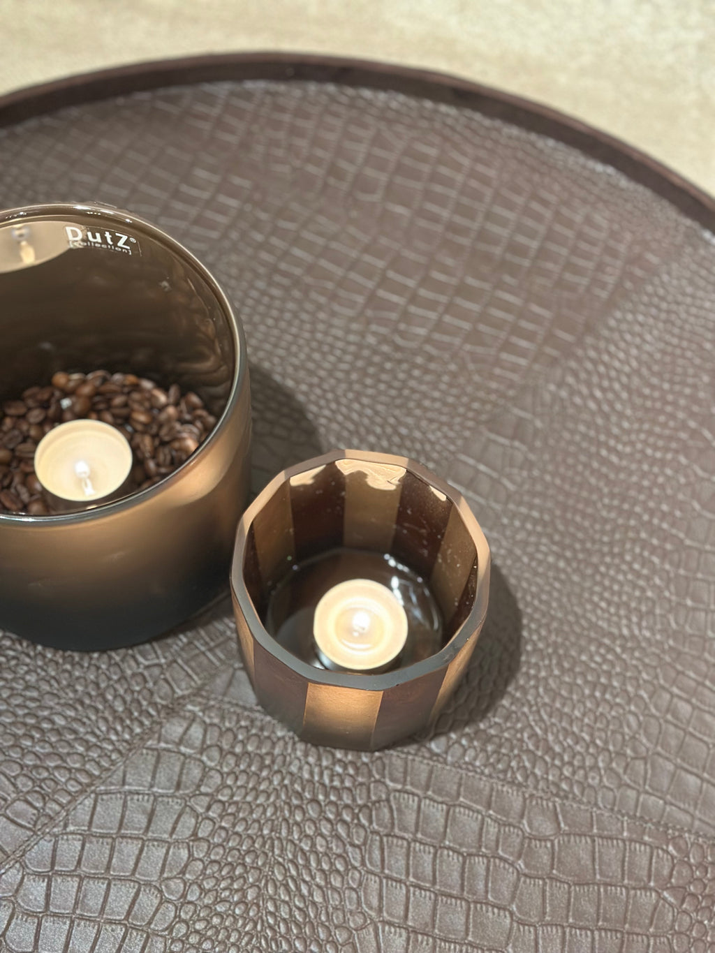 Het leer is behandeld zodat je het gemakkelijk kunt schoonmaken met een vochtige doek. Perfect om een groep kaarsen, een vaas of meerdere accessoires samen te brengen.