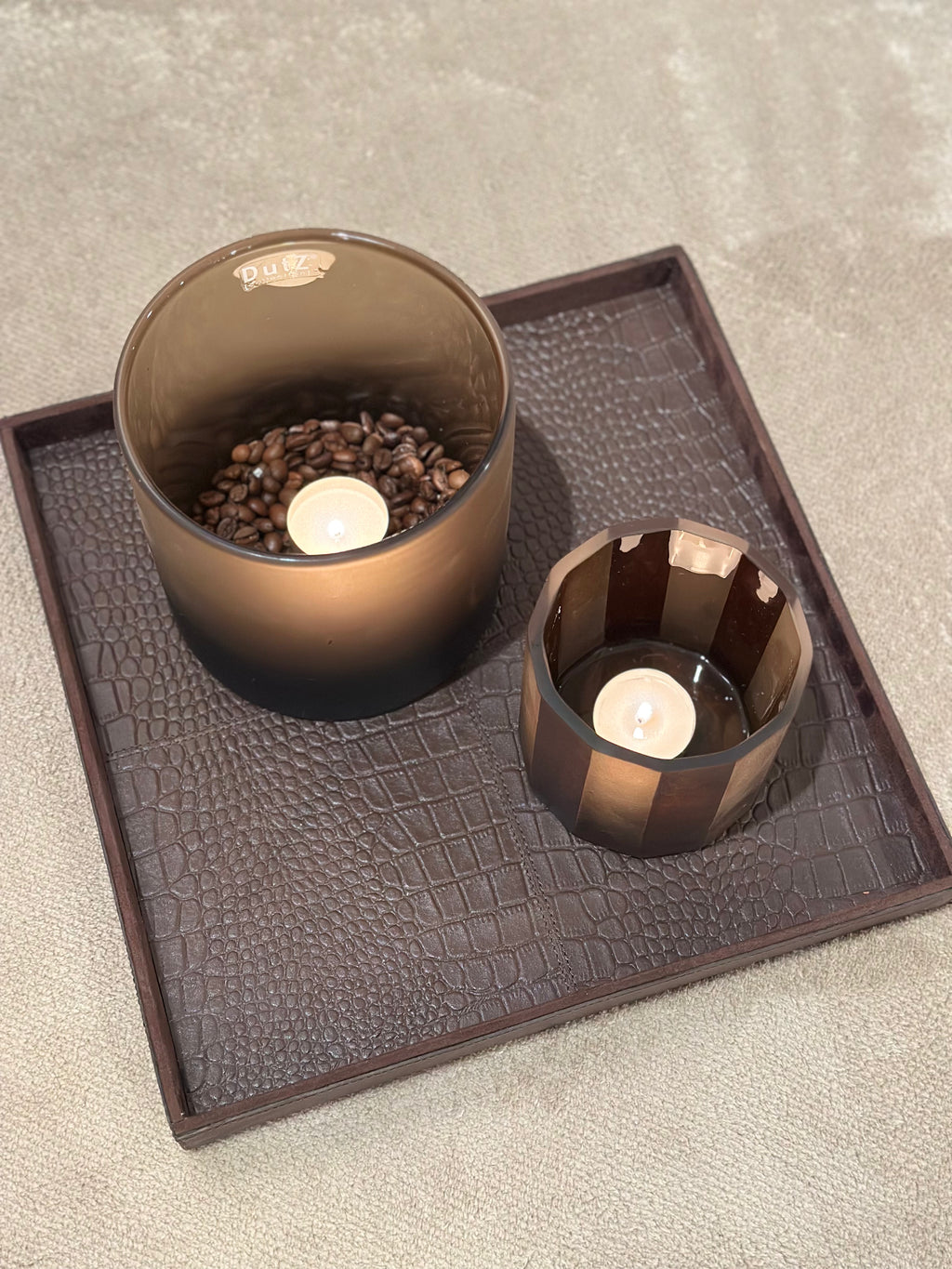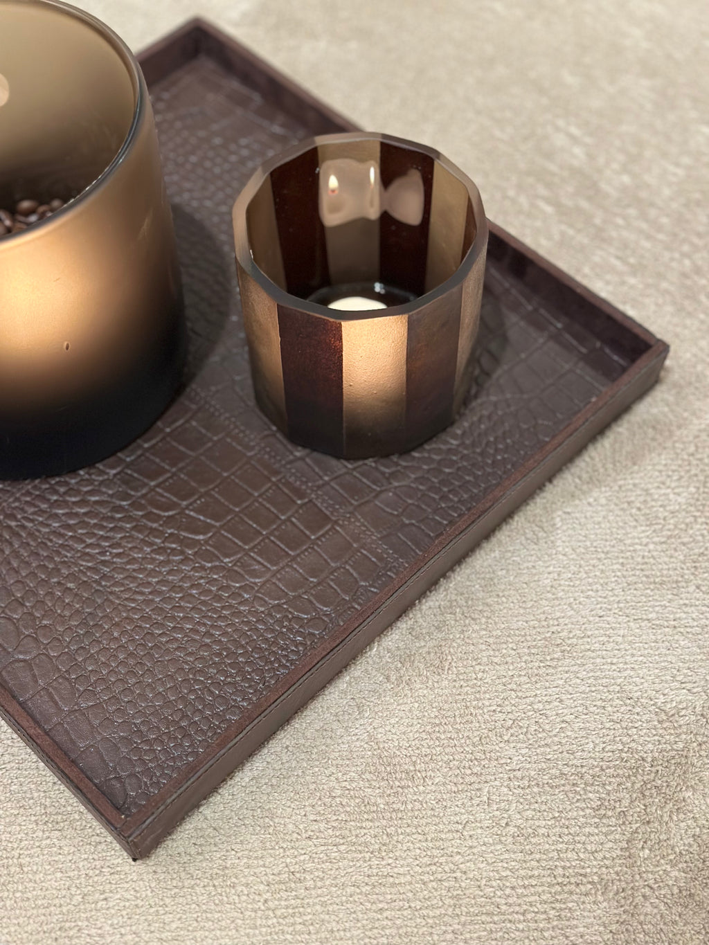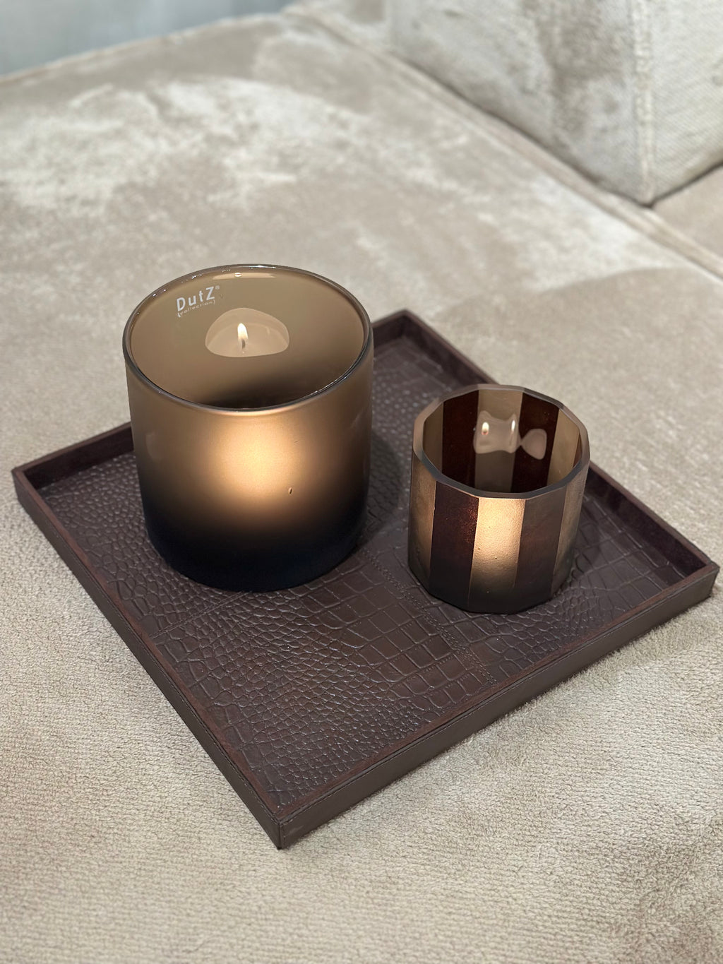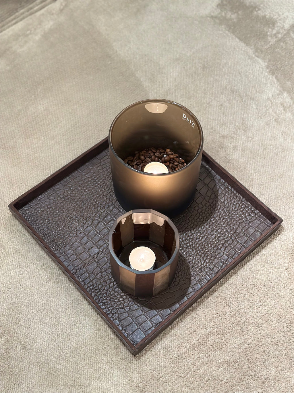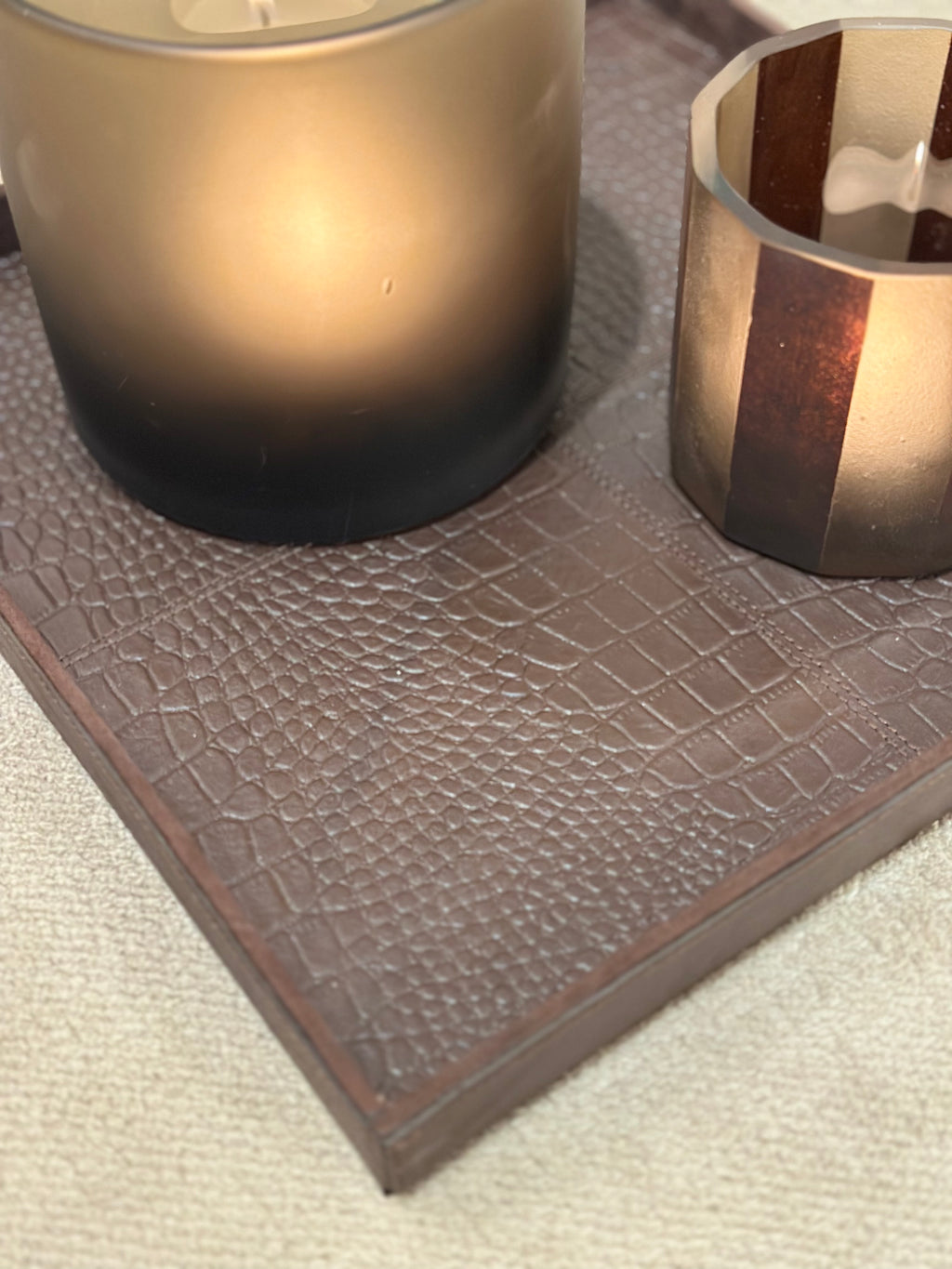 Dit vierkante dienblad in maat S is een fijne basis voor een groepje kaarsen of een mooie vaas. Gemaakt van hoogwaardig rundsleer met donkerbruine krokoprint.
