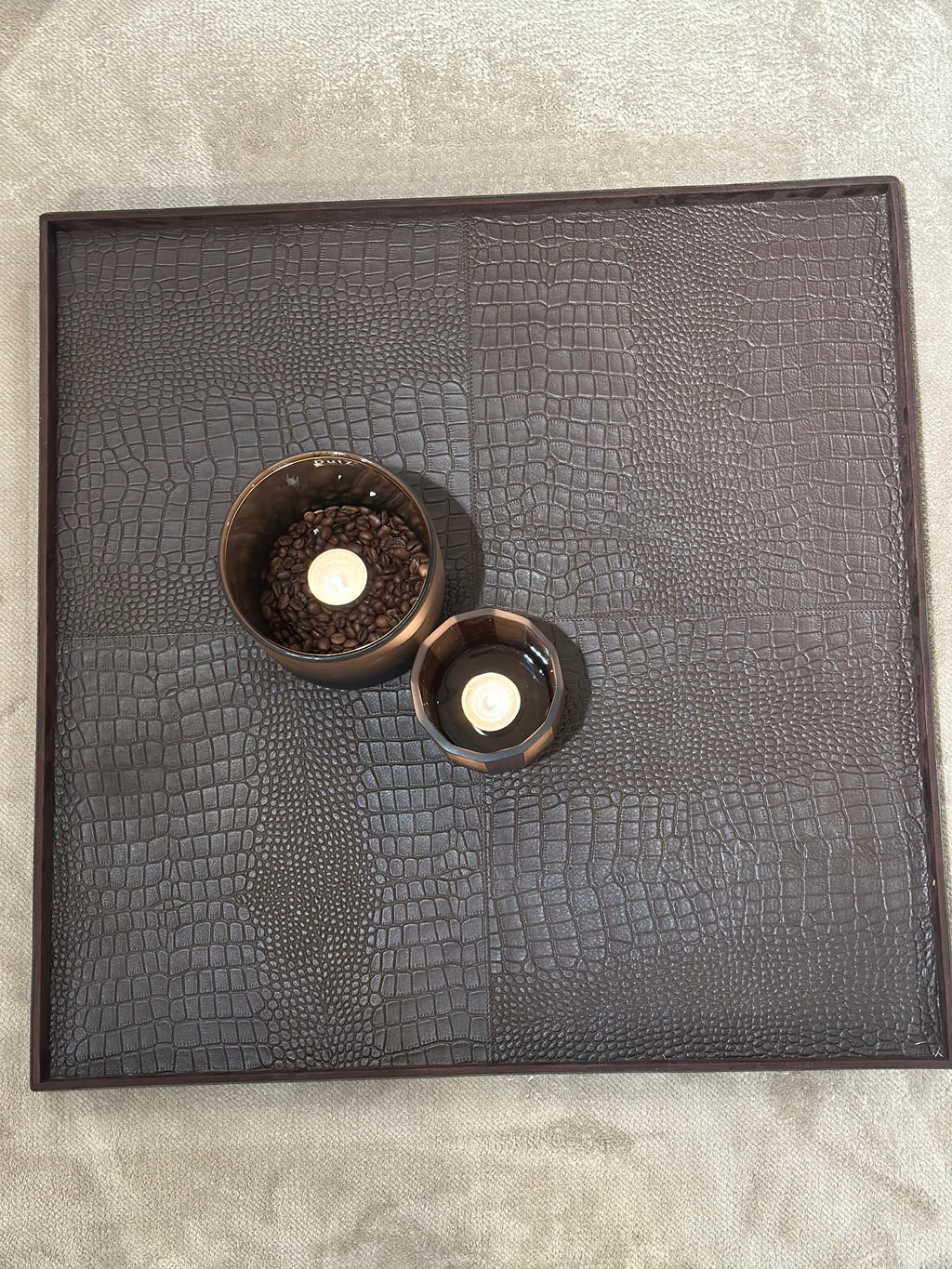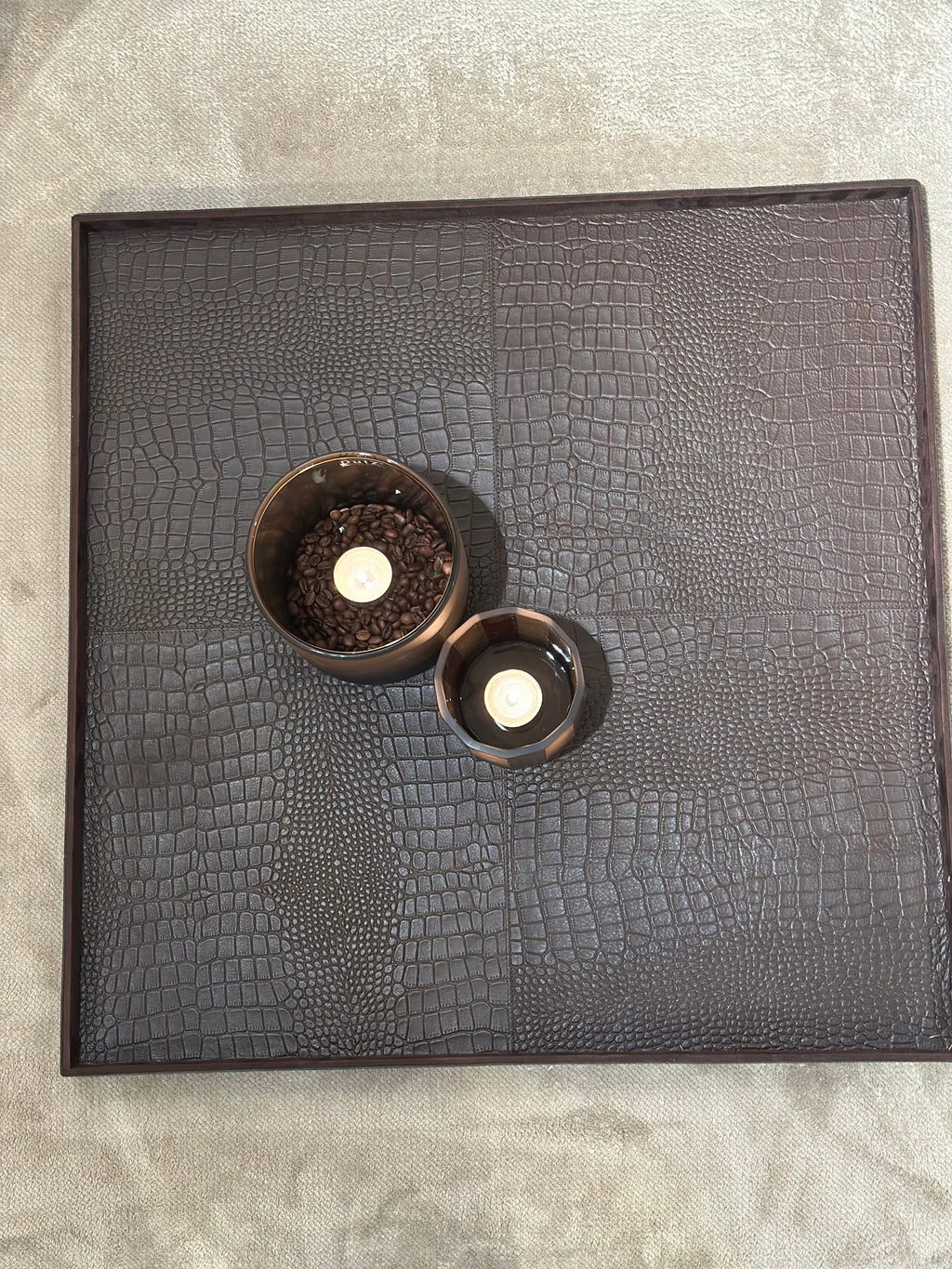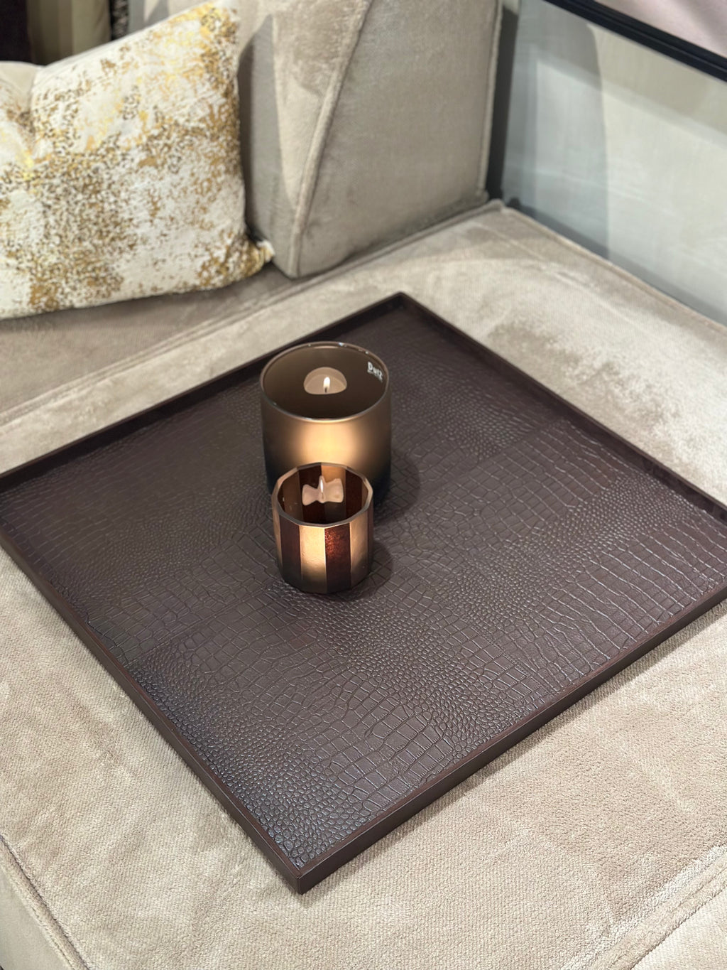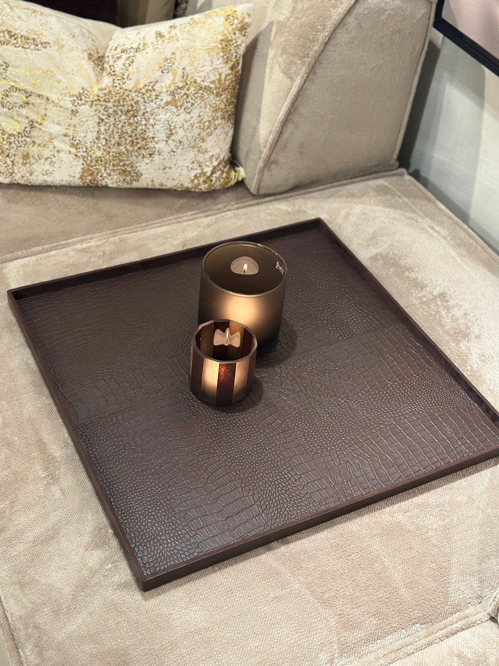 Dit XL vierkante dienblad is een echte basis voor een grote salontafel of ottomane. De donkerbruine krokoprint in rundsleer geeft warmte en karakter.
