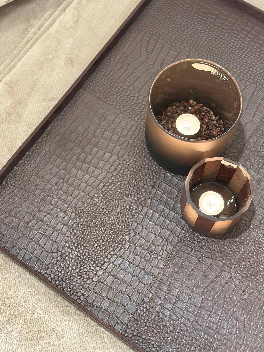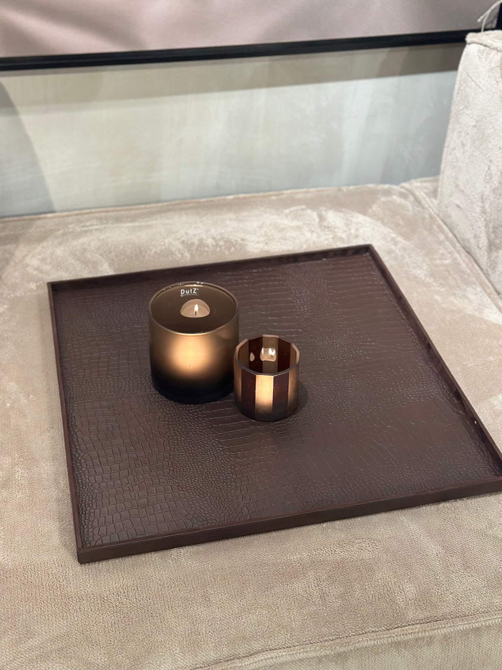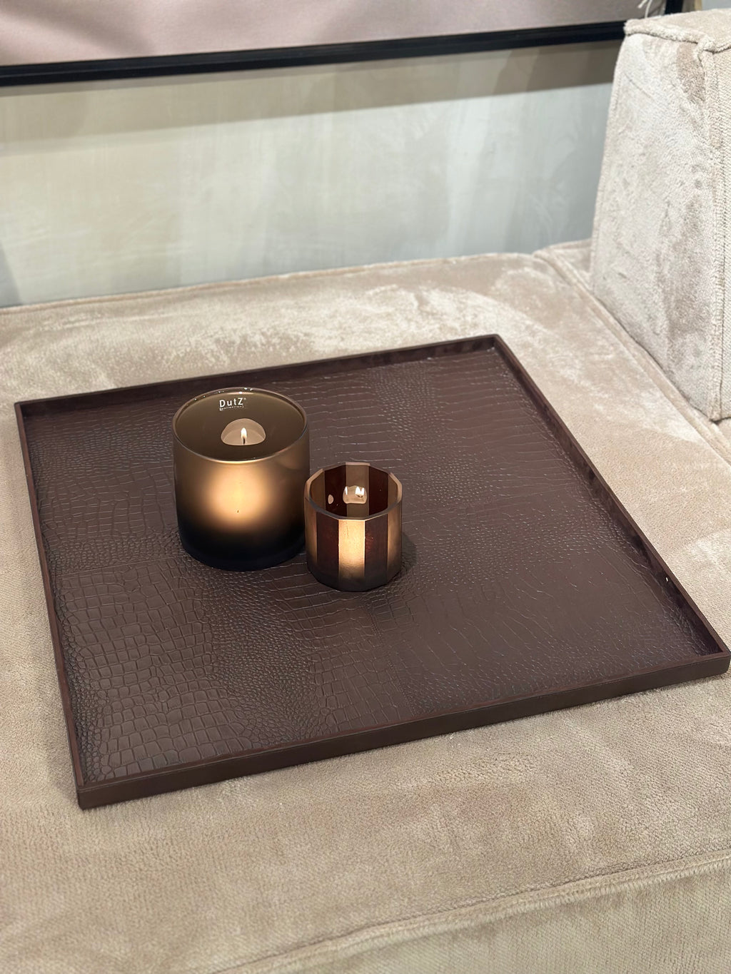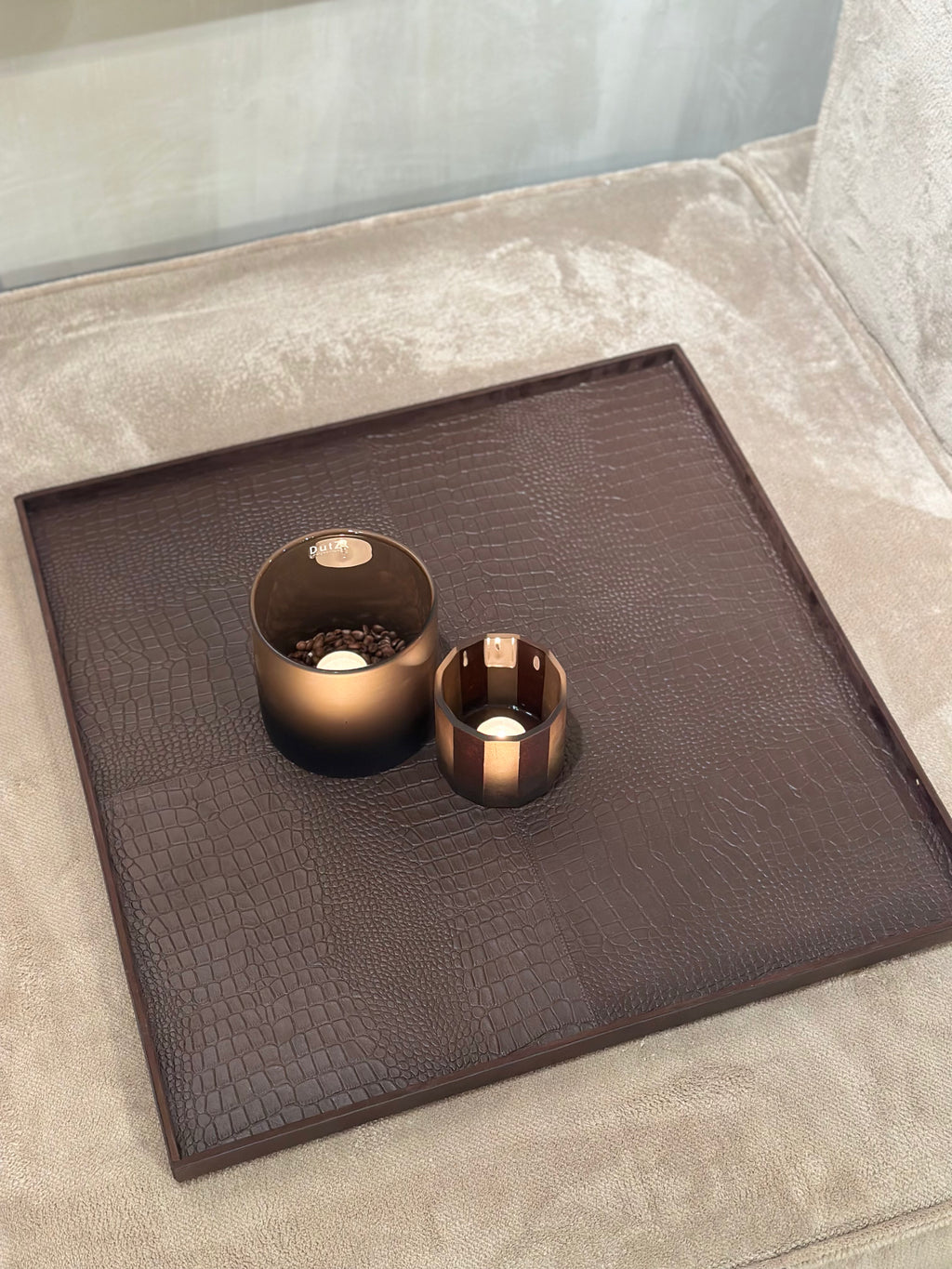 Dit XL vierkante dienblad is een echte basis voor een grote salontafel of ottomane. De donkerbruine krokoprint in rundsleer geeft warmte en karakter.