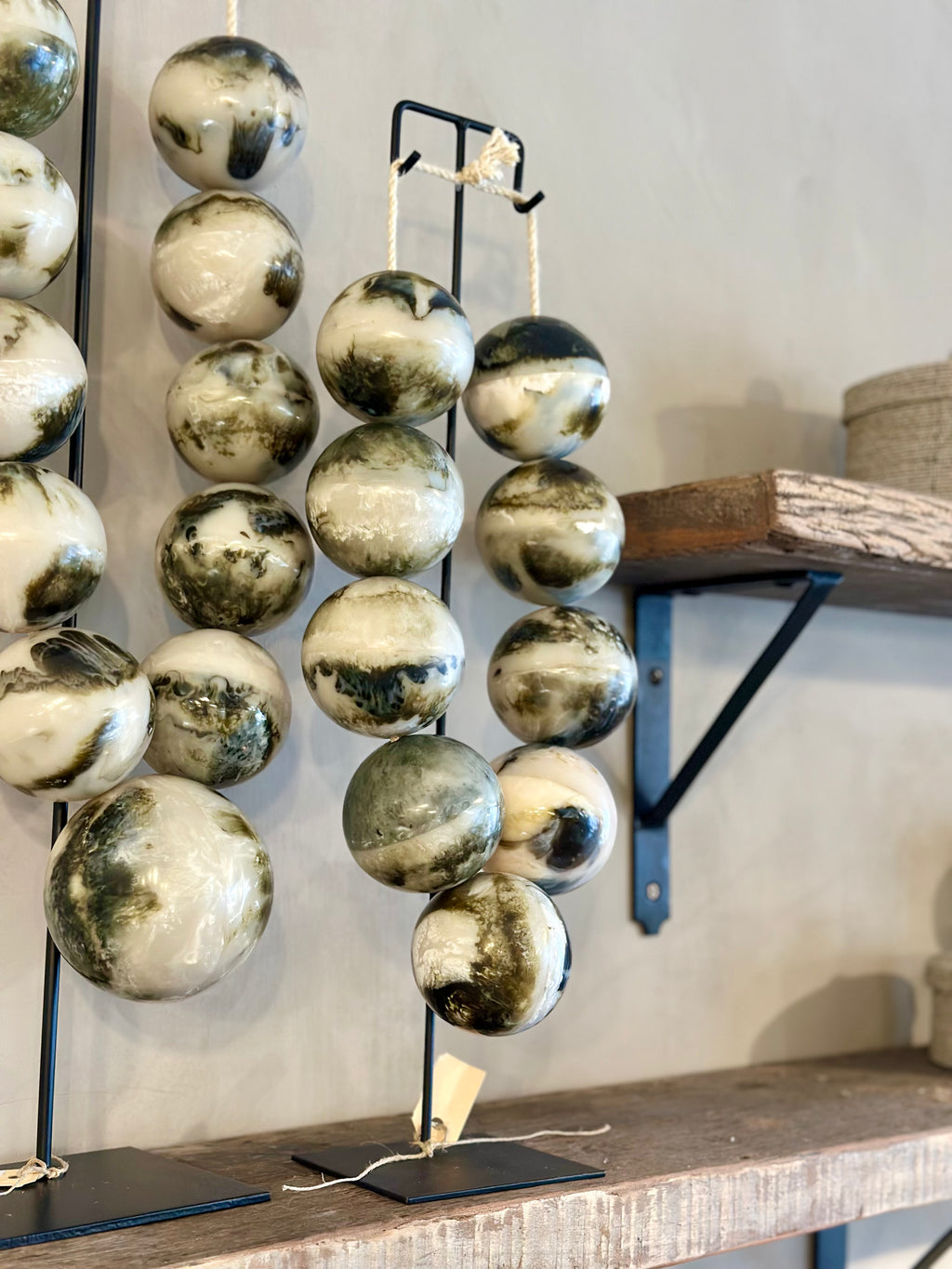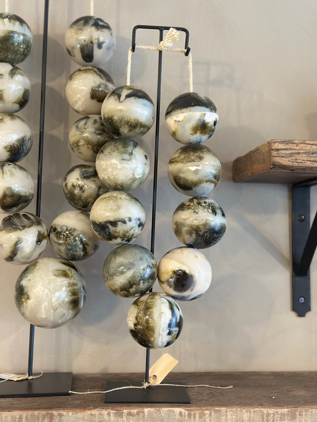 De kralen hebben een marmerachtige tekening waardoor elke ketting net iets anders oogt. Dat maakt het een mooi object om neer te zetten op een zuil, in een vensterbank of op een dressoir. Door de hoogte krijgt het item een echte plek in het interieur.