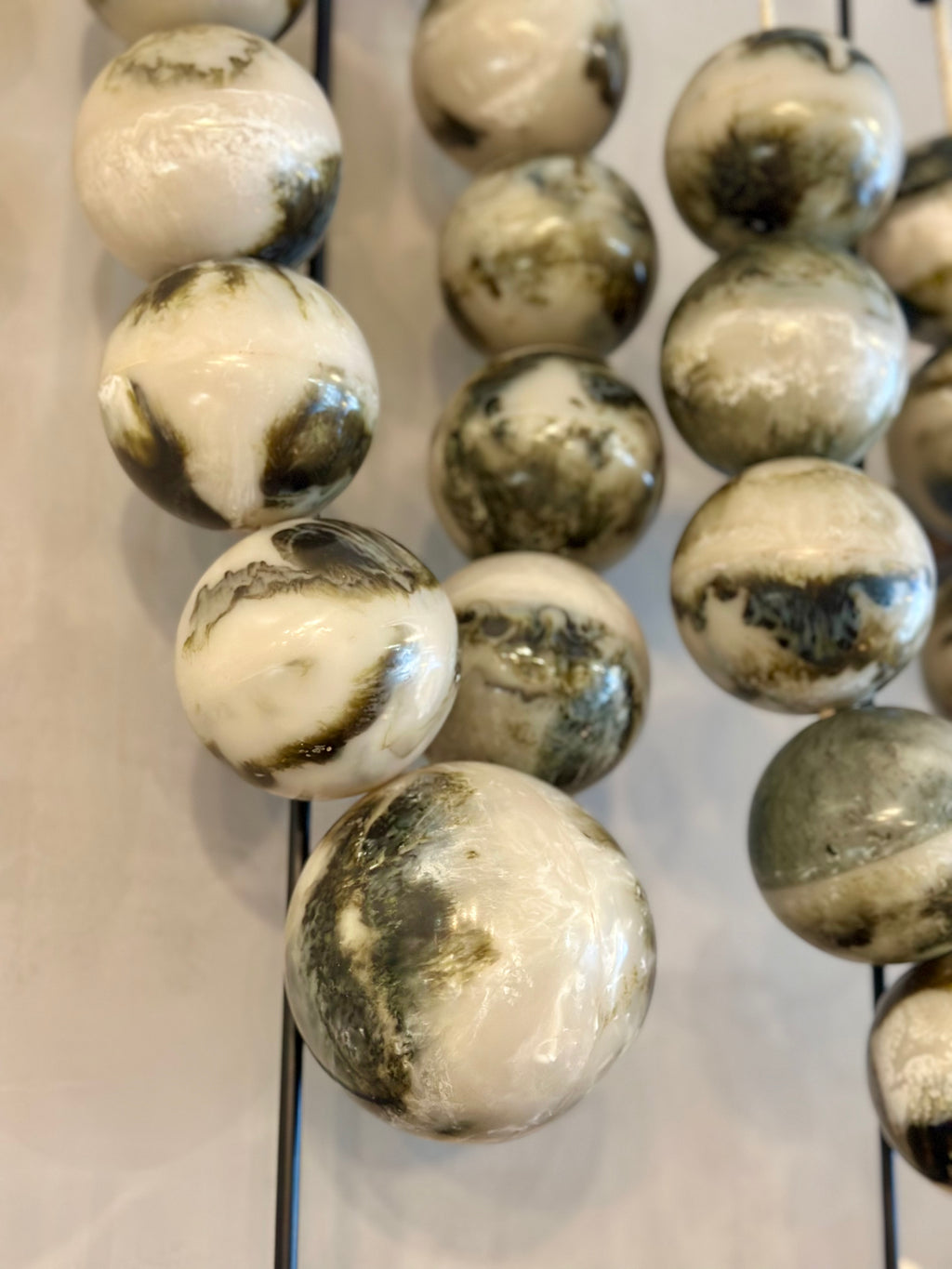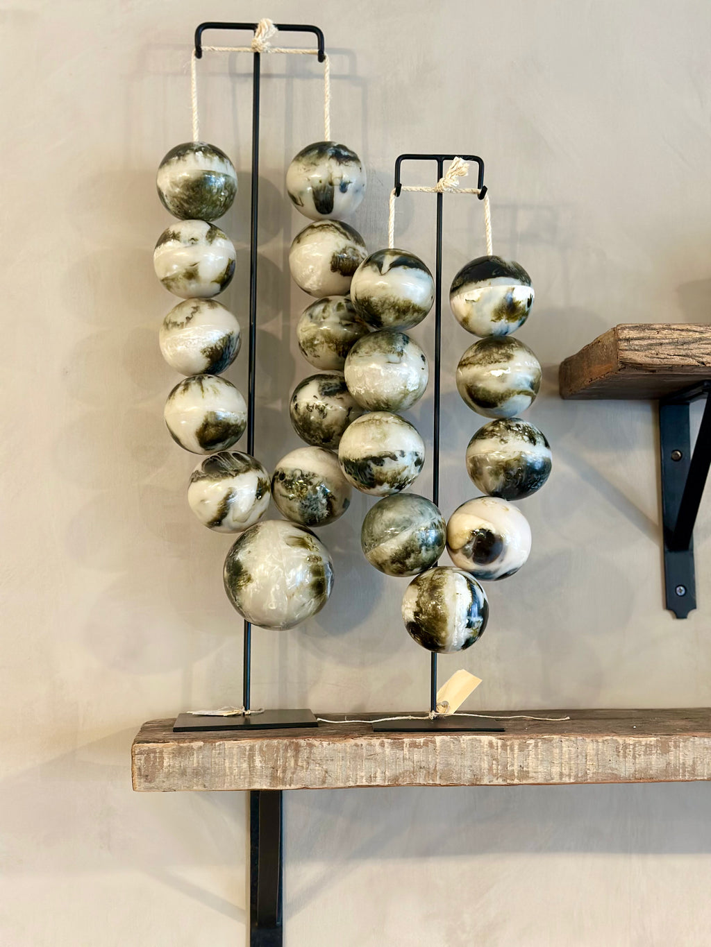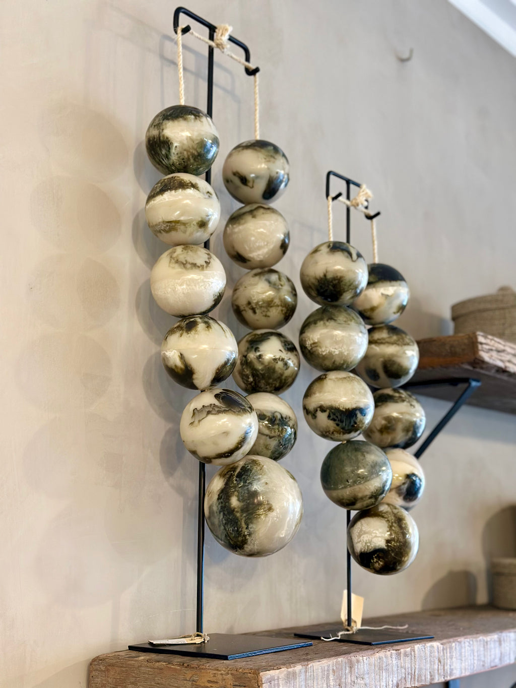 Deze grote kralenketting heeft kralen met een groene marmer-look en hangt aan een zwart stalen statief. De groenige tinten in de kralen geven deze ketting die unieke look.