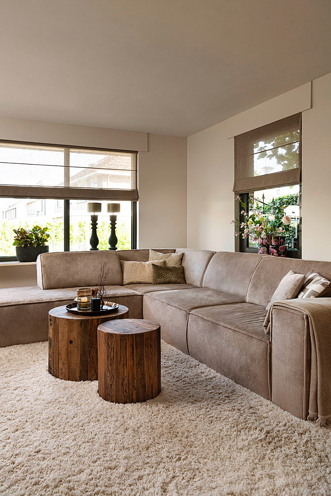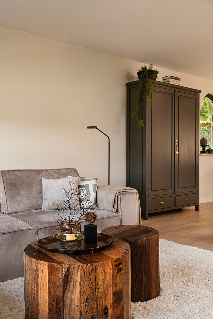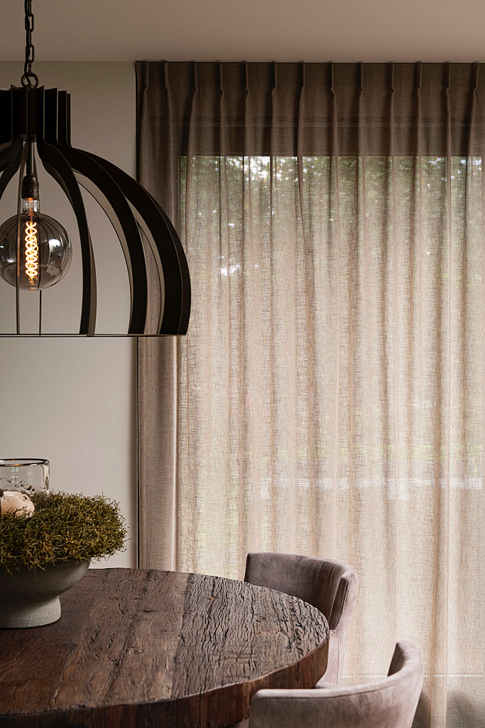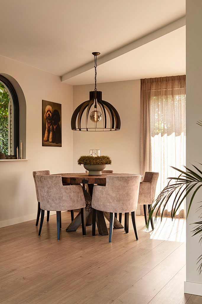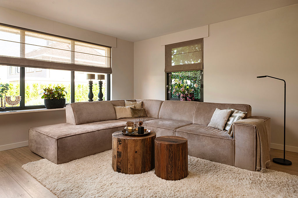 Er werd in de gehele woning gekozen voor een landelijke en rustieke sfeer, gecombineerd met een chique touch. De houtlook vloer en de stoere houten meubels met de linnenlook gordijnen stralen rust uit en in combinatie met de glanzende, rijke stoffen die op de meubels gekozen zijn krijgt dit naturelle palet wat cachèt! En dat cachèt verdient deze prachtige woning ook.