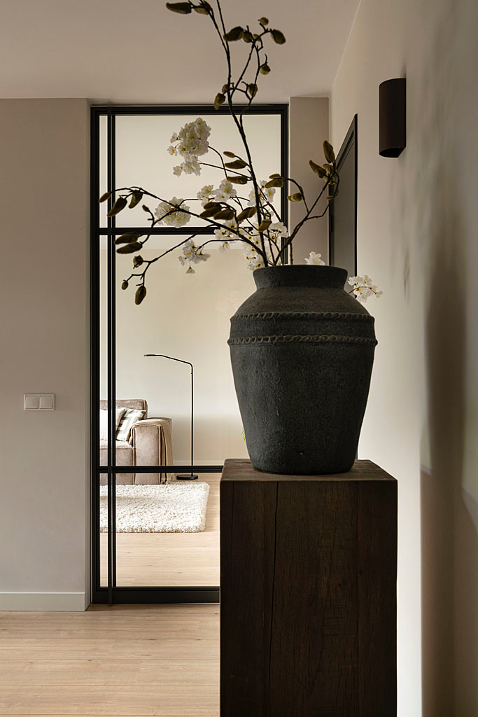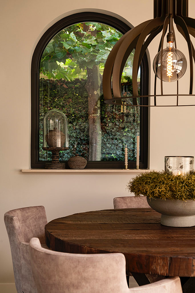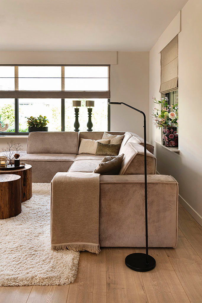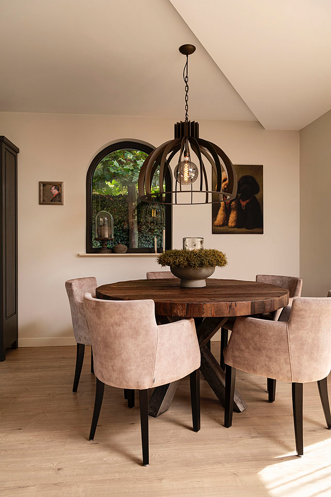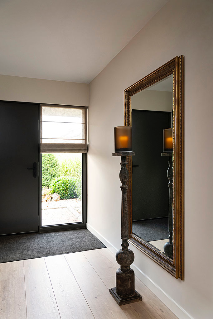 Er werd in de gehele woning gekozen voor een landelijke en rustieke sfeer, gecombineerd met een chique touch. De houtlook vloer en de stoere houten meubels met de linnenlook gordijnen stralen rust uit en in combinatie met de glanzende, rijke stoffen die op de meubels gekozen zijn krijgt dit naturelle palet wat cachèt! En dat cachèt verdient deze prachtige woning ook.