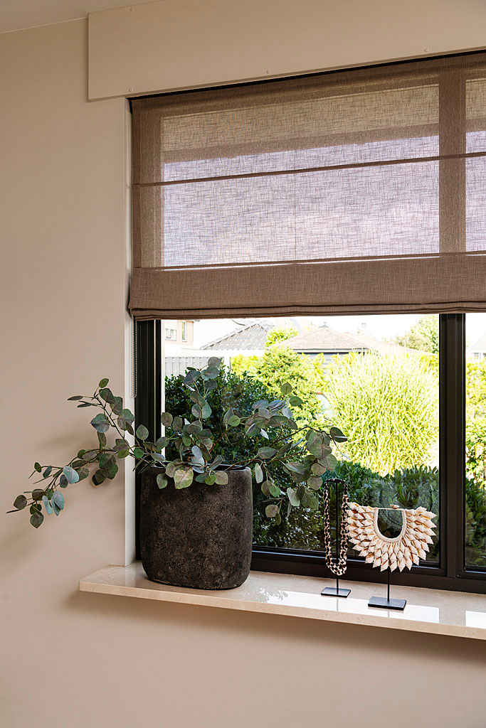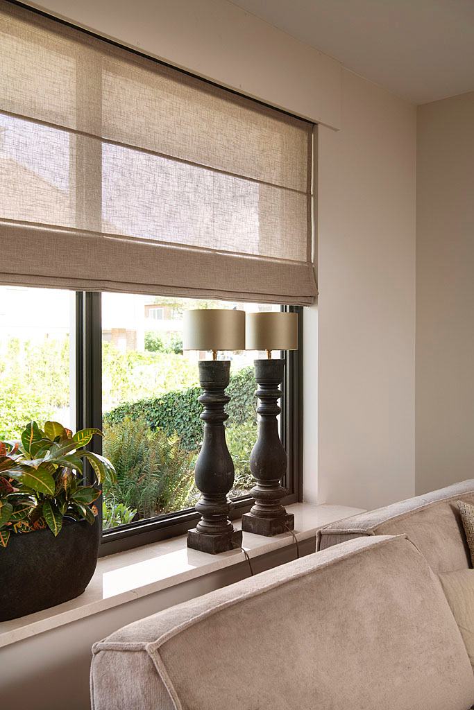 De vouwgordijnen zijn linnen-look en laten mooi het licht gefilterd naar binnen komen. Ook hier is er in de afstyling gekozen voor een landelijke basis met een beetje flair: baluster lampen met een satijnen lampenkapje.