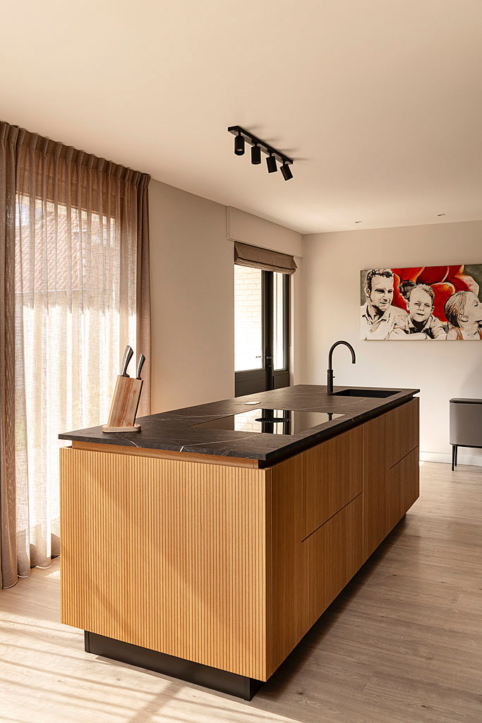 Het licht wordt via de metersbrede schuifpui mooi naar binnen gefilterd, zonder dat deze de ruimte donker maken! Toch zitten de bewoners lekker privé 's avonds aan de keukentafel.