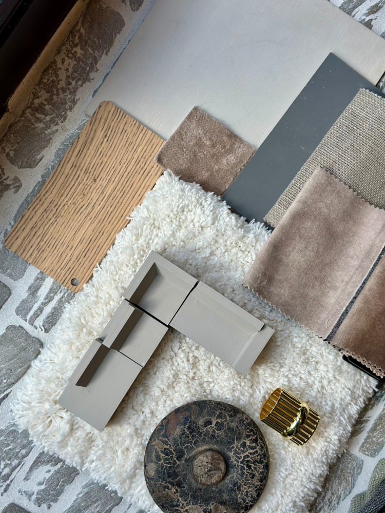 Dit was dan het moodboard geworden met de uitgekozen stoffen, houtkleur van de vloer, verfkleuren en de details voor de afstyling. Een rustieke, landelijke basis met een chique en rijke toevoeging.