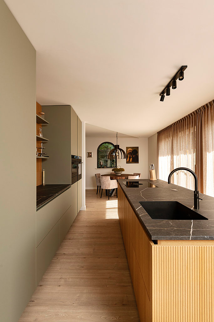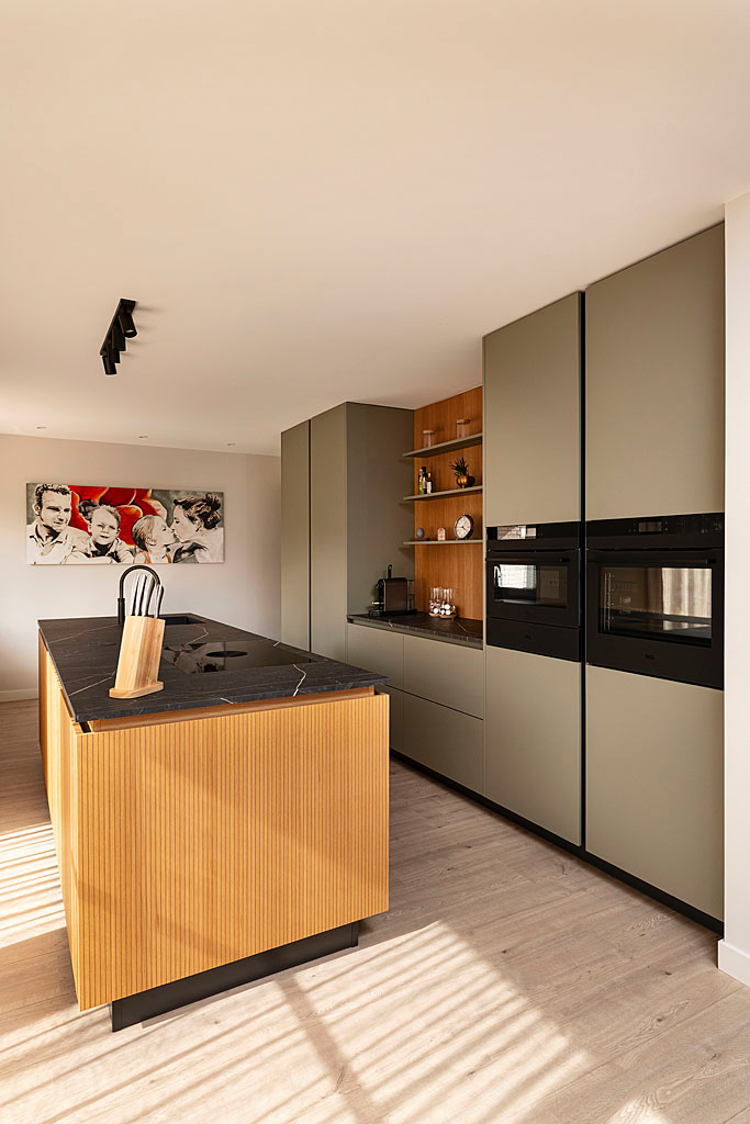 De fantastische mooie leefkeuken is echt het hart van het huis, de warme houtkleur en het frisse, zachte groen komt overal in huis weer terug in de afstyling en details.