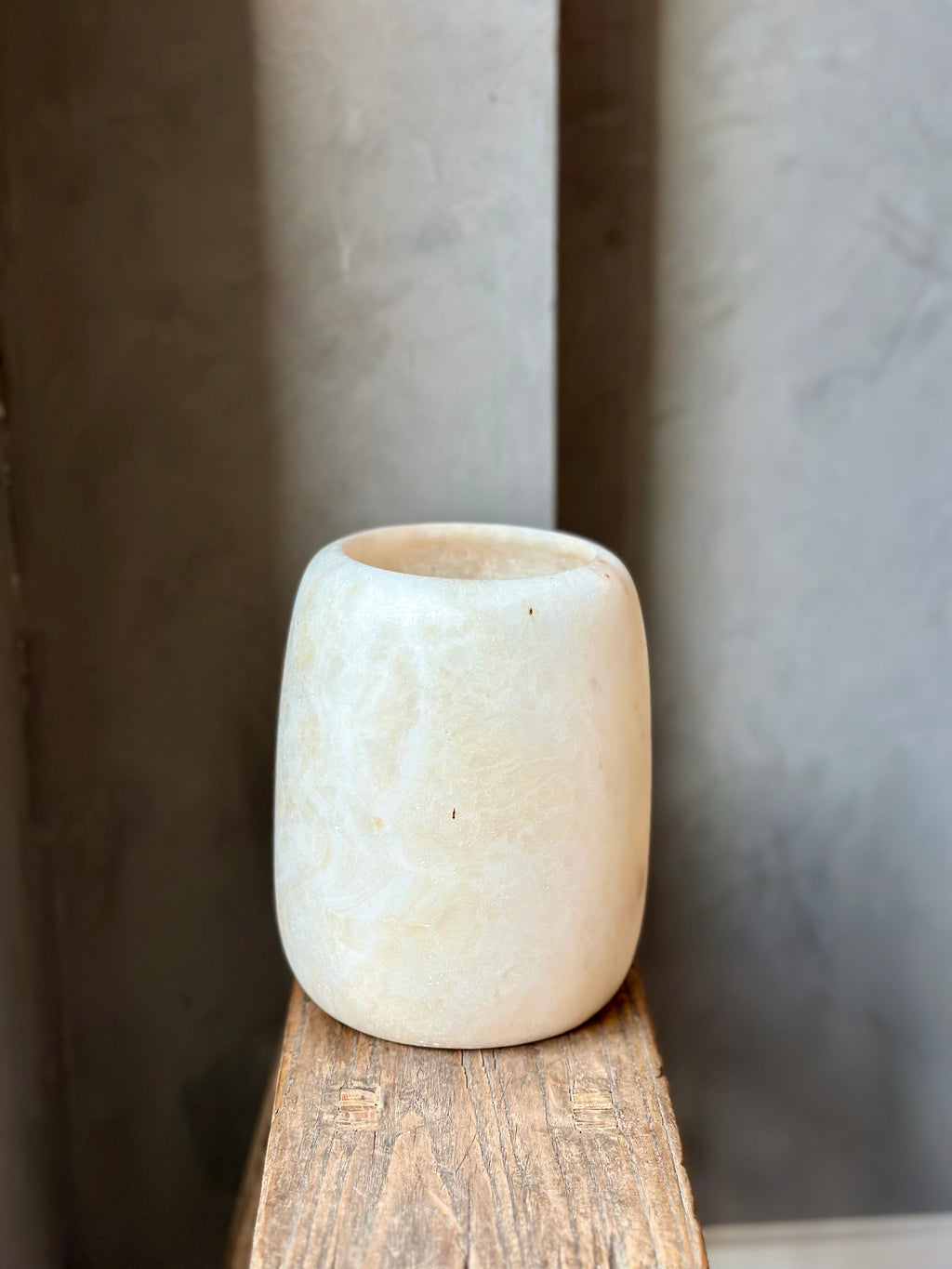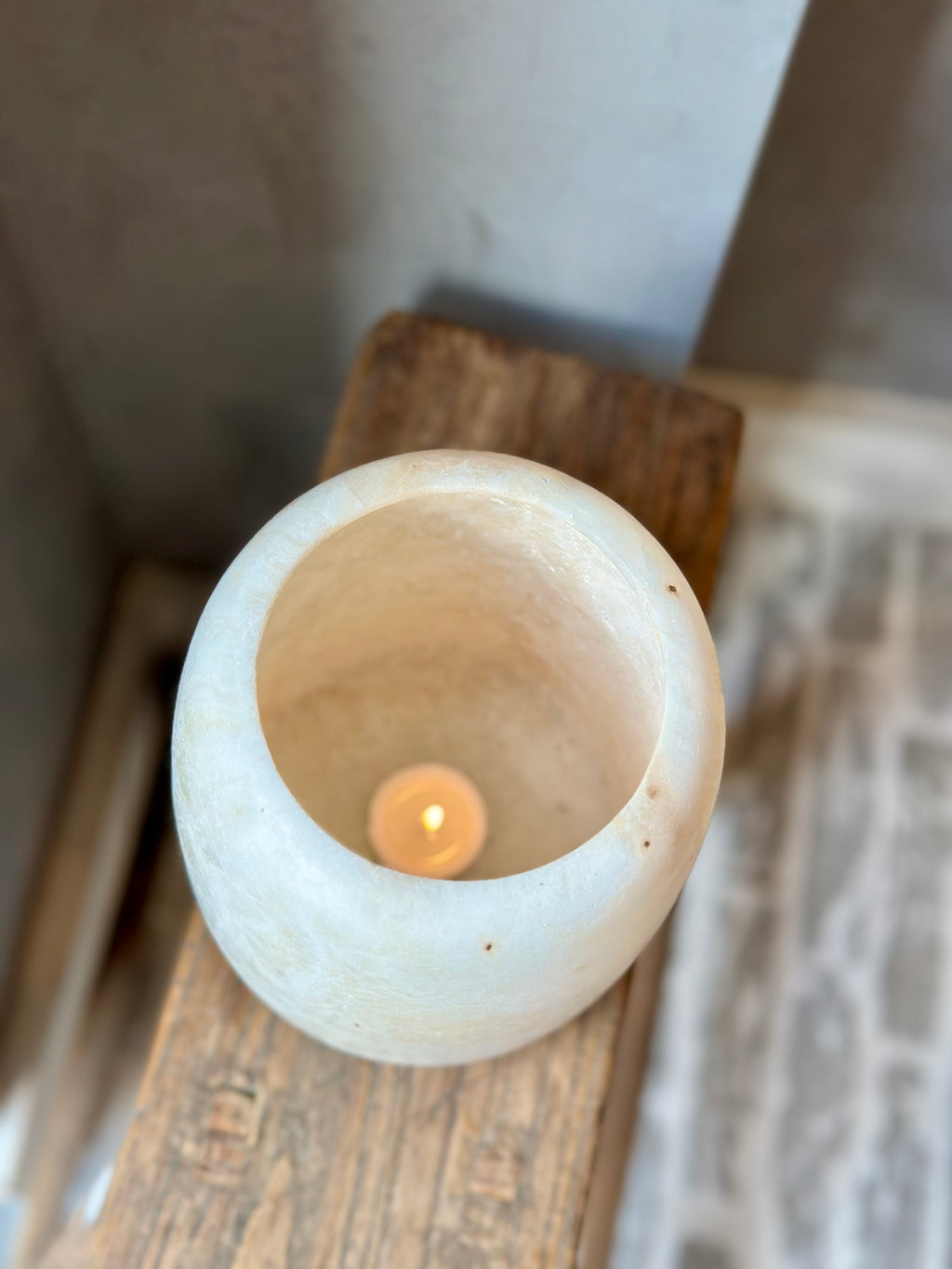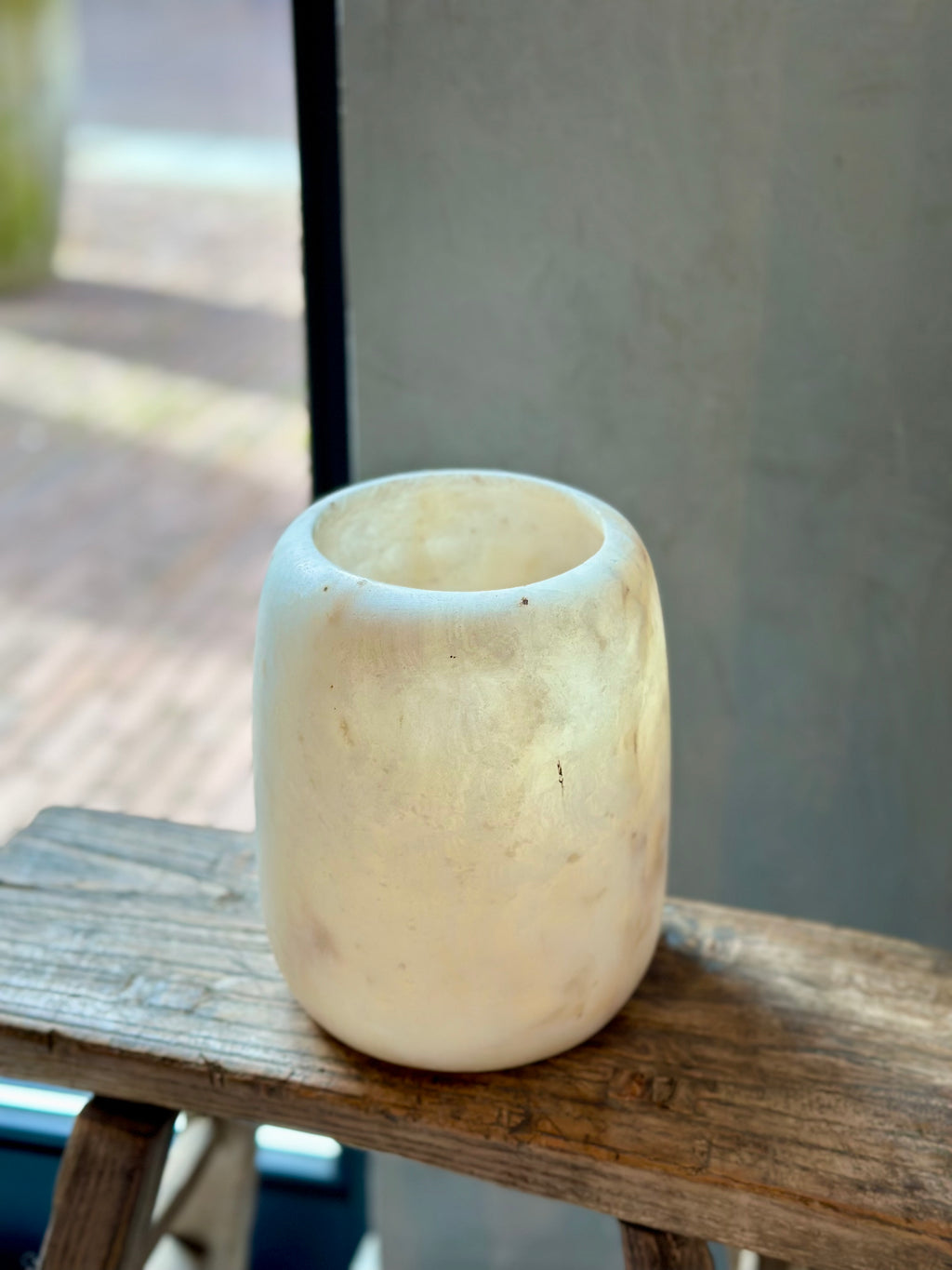 Dit albast windlicht heeft een warme natuurlijke uitstraling door de lichte tot amberkleurige marmering in het gesteente. Albast laat licht zacht door, waardoor een kaarsje een rustige en sfeervolle gloed geeft.