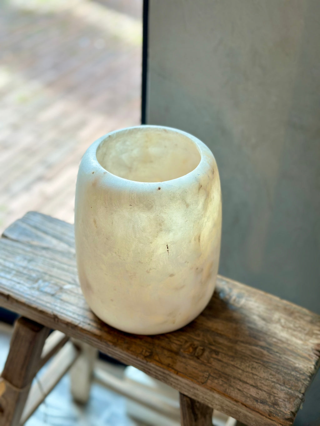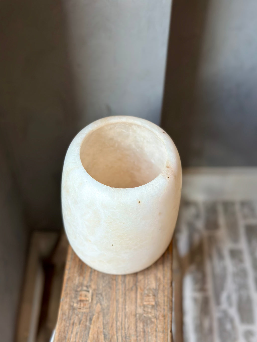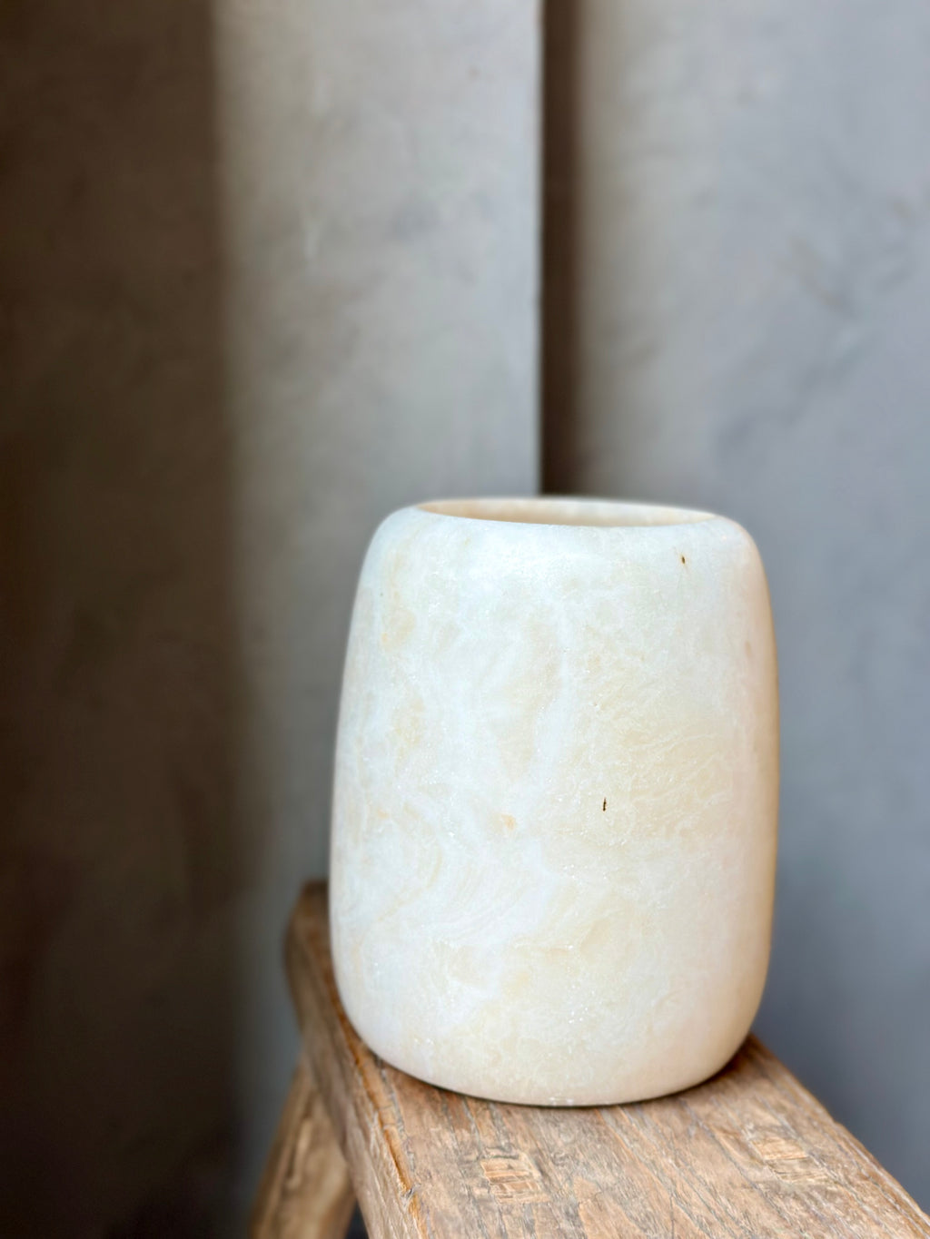 Dit albast windlicht heeft een warme natuurlijke uitstraling door de lichte tot amberkleurige marmering in het gesteente. Albast laat licht zacht door, waardoor een kaarsje een rustige en sfeervolle gloed geeft.
