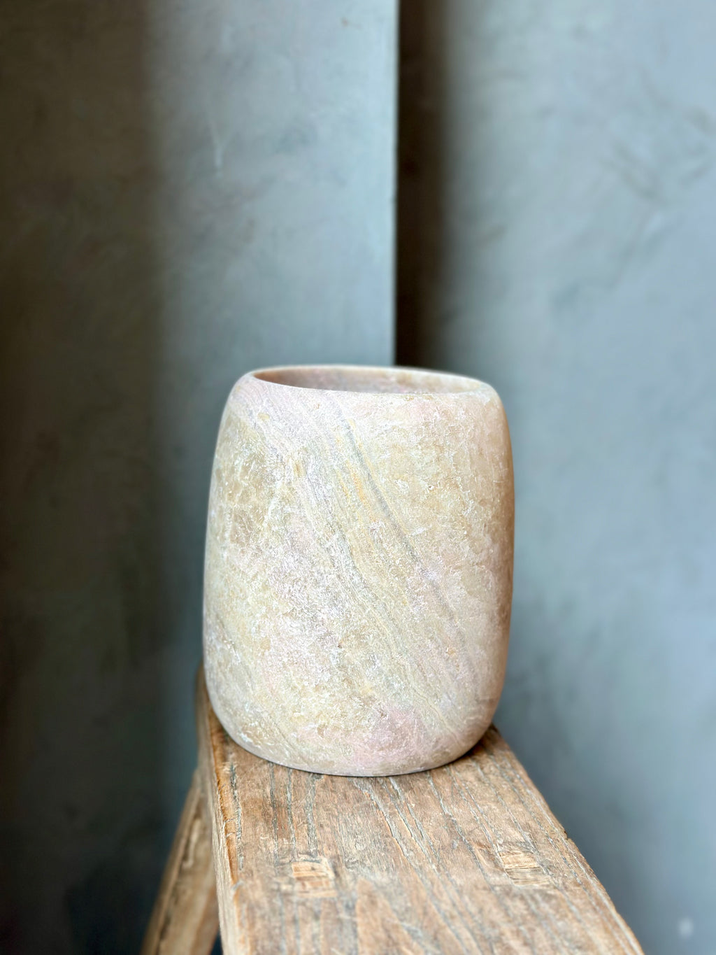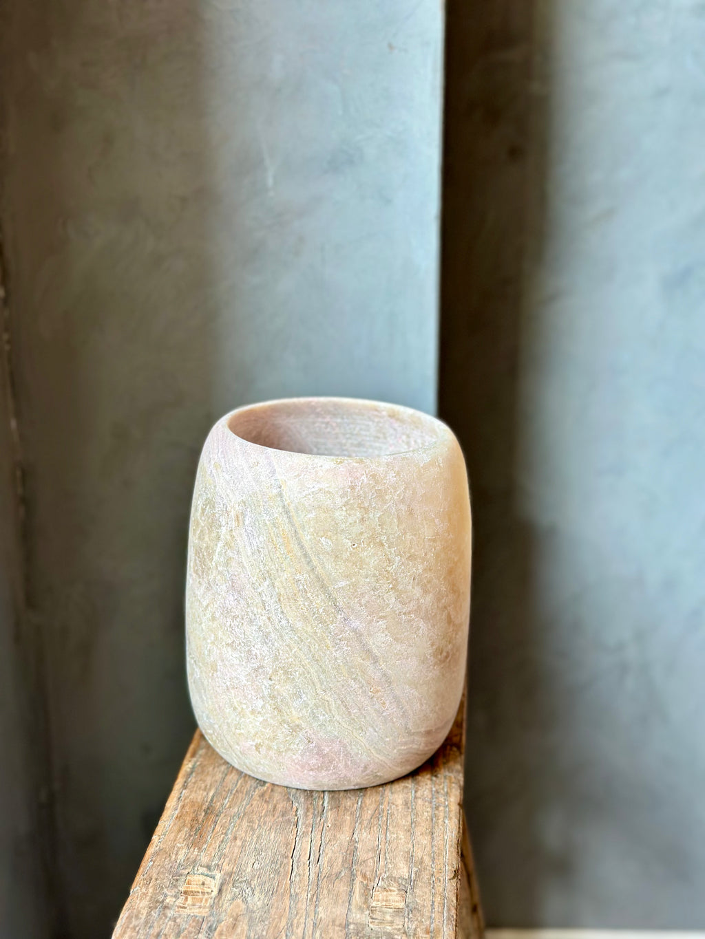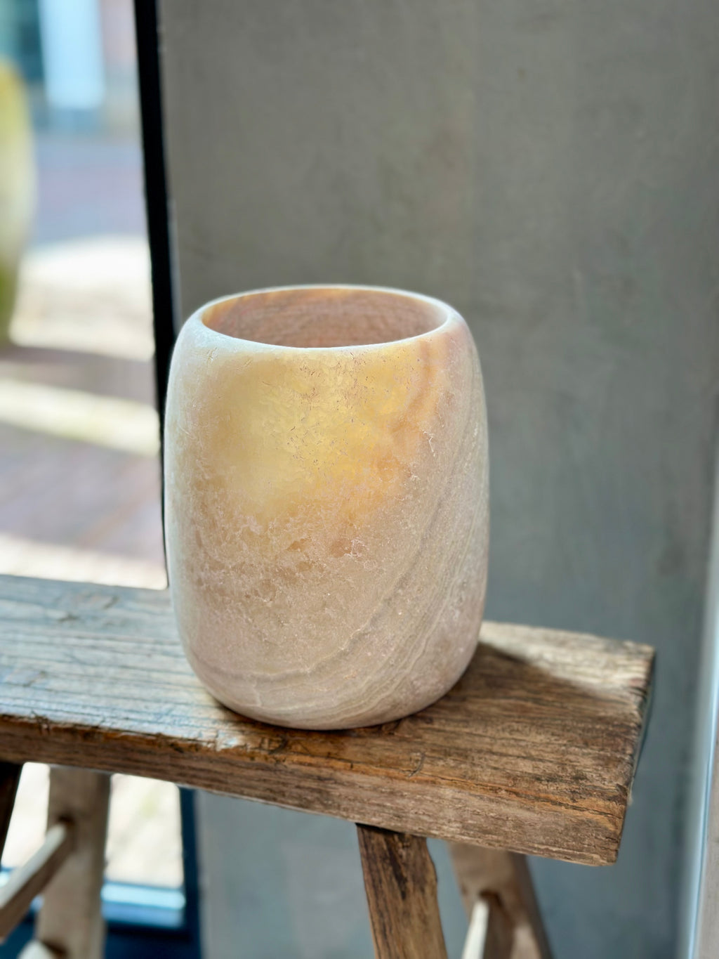 Dit windlicht van albast heeft een natuurlijke uitstraling met zachte kleurverschillen in het gesteente. De tinten variëren van licht beige tot warm amber met een mooie marmering.